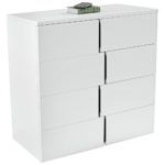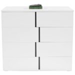 Štýlová komoda SPLIT vás nadchne moderným dizajnom v bielej farbe s vysokým leskom v kombinácii s čiernymi prvkami. S rozmermi 100 x 90 x 42 cm (Š/V/H) sa perfektne hodí do každej obývacej izby, či jedálne. Je vybavená 1 dverami a 4 zásuvkami, za ktorými sa ukrýva množstvo úložného priestoru na odkladanie časopisov, riadu, dekorácii a mnoho ďalšieho. Dvere s originálne riešenými, vyfrézovanými úchytkami vyzdvihujú jej originálny vzhľad, vďaka ktorému spestrí každú miestnosť. Osviežte si svoj domov so štýlovou komodou SPLIT!