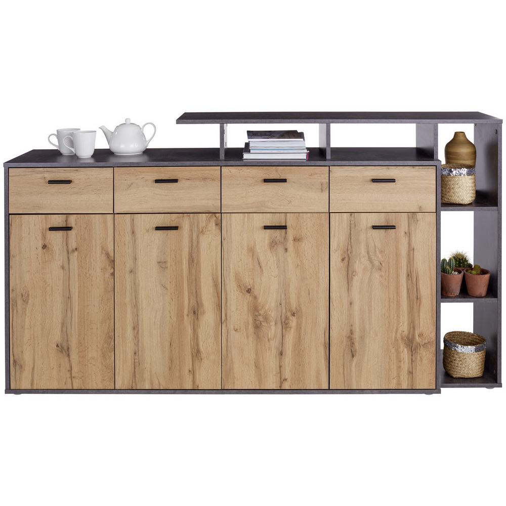 Táto exkluzívna komoda TOM 4 s korpusom vo vzhľade tmavého betónu skutočne šetrí priestor. Využite výhody veľkorysého úložného priestoru tejto komody s rozmermi približne 190 x 105 x 40 cm (Š/V/H) s piatimi otvorenými priehradkami, štyrmi zásuvkami a štyrmi dvierkami v dekore dub Wotan! Za dverami sa nachádzajú ešte ďalšie 4 odkladacie priečinky. Komoda ponúka dostatok priestoru na uloženie riadu, kníh aj ozdobných predmetov. Úchytky z čierneho plastu završujú celkový obraz a otváranie a zatváranie dverí a zásuviek je detskou hrou. Celkovo môže komoda uniesť zaťaženie až 100 kilogramov. Táto komoda kombinuje mimoriadny dizajn s veľkým priestorom. K dispozícii je aj v iných farbách! V našom internetovom obchode nájdete tiež ďalší nábytok z kategórií drevené komody, sivé komody a