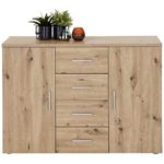 Komoda TRIO NEW s 4 zásuvkami a 2 dvierkami ponúka dostatok priestoru a obohatí vašu obývaciu izbu o moderný kus nábytku. V dekore dub Artisan a s chrómovanými úchytmi vyzerá komoda moderne a dýcha na vás príjemnou atmosférou. Povrch je melamínový, preto je aj údržba veľmi jednoduchá. V štyroch zásuvkách môžete mať na dosah všetko od poznámkového bloku až po hracie karty. Za dvomi dvierkami sa nachádzajú 2 police (4 priehradky), každá s hrúbkou asi 16 mm a nosnosťou 5 kg. Police predstavujú ideálne miesto pre úhľadné uloženie váz, riadu alebo kníh. Celkovo možno komodu, s rozmermi približne 120 x 86 x 50 cm (Š x V x H), zaťažiť do 30 kg. Môžete ju vyzdobiť kvetmi a dekoratívnymi predmetmi, aby sa vytvorilo štýlové prostredie. Tento model TRIO NEW sa dodáva v rôznych veľkostiach.