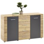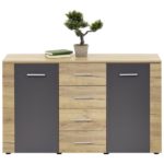Funkčná komoda je vyhotovená v trendovej farebnej kombinácii dekoru dub Kraft s lávovo-sivými hranami. S rozmermi 140 x 80 x 40 cm (š/v/h) je praktická komoda Uno ideálna na skladovanie vecí v obývacej izbe, jedálni alebo spálni. Pozostáva z dvoch dverí, dvoch vkladacích políc a 4 praktických zásuviek, vďaka ktorým budete mať k dispozícii veľký úložný priestor – perfektná komoda na vytvorenie modernej atmosféry so štýlom!