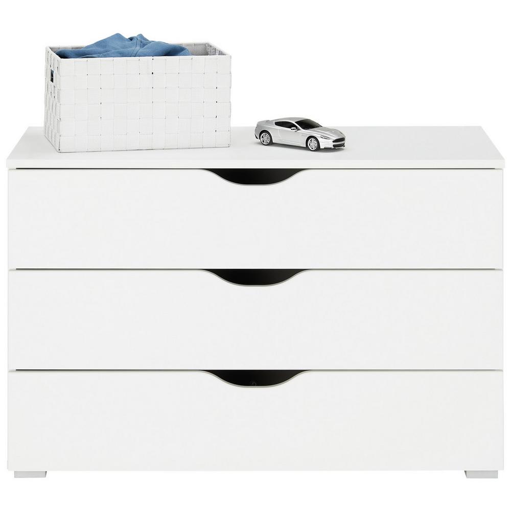 S nábytkovou sériou WHITE do detských izieb vytvoríte harmonické prostredie vašim potomkom od útleho veku až po teenagerské časy: Od prebaľovacieho pultu a postieľky až po písací stôl, regály a veľké skrine. Jednoduchý, ale útulný nábytok bez zbytočných ozdôb v alpskej bielej farbe je doplnený bezpečnými úchytmi v podobe výrezov. Táto zásuvková komoda boduje lineárnym vzhľadom, ktorý podčiarkujú otvory na zásuvkách, ktoré slúžia ako úchyty. Komoda ponúka praktický úložný priestor v troch širokých zásuvkách na čokoľvek – od oblečenia, po školské potreby a hračky. Tento nábytok je možné doplniť aj o závesnú tyč na oblečenie a tašky, čím prakticky a vkusne vyplní priestor nad komodou. Nájdete ju pod číslom výrobku 0380075706. Komoda WHITE s rozmermi približne 93 x 62 x 42 cm (Š x V x H) má, tak ako aj ostatný nábytok z tejto série, certifikačné známky Blue Angel, BQ – Alliance for Quality a Made in Germany, čo svedčí o vynikajúcej kvalite tohto kusu nábytku.