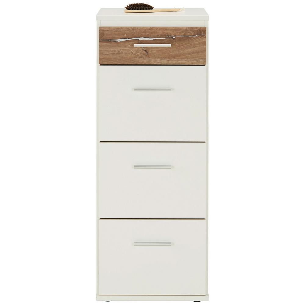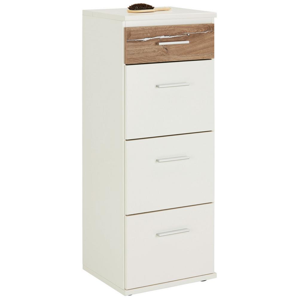 Táto elegantná zásuvková komoda je súčasťou série YOUNG a je ideálnym doplnkom moderne zariadenej detskej izby alebo izby pre mladých. S rozmermi približne 46 x 121 x 40 cm (Š/V/H) je vyrobená s bielym dekorom, ktorý vkusne dopĺňa jedna zásuvka v dekore dub Flagstaff. Celkom má k dispozícii štyri zásuvky v dvoch rozmeroch, kde môžete ukladať najrôznejšie veci. Veľké plus: okrem elegantného vzhľadu, kompaktnému rozmeru a skvelého úložného priestoru ponúka tento nábytok výklopnú hornú policu, pod ktorou sa nachádza integrované zrkadlo. Zariaďte izbu svojho potomka prakticky a štýlovo s nábytkovou sériou YOUNG!