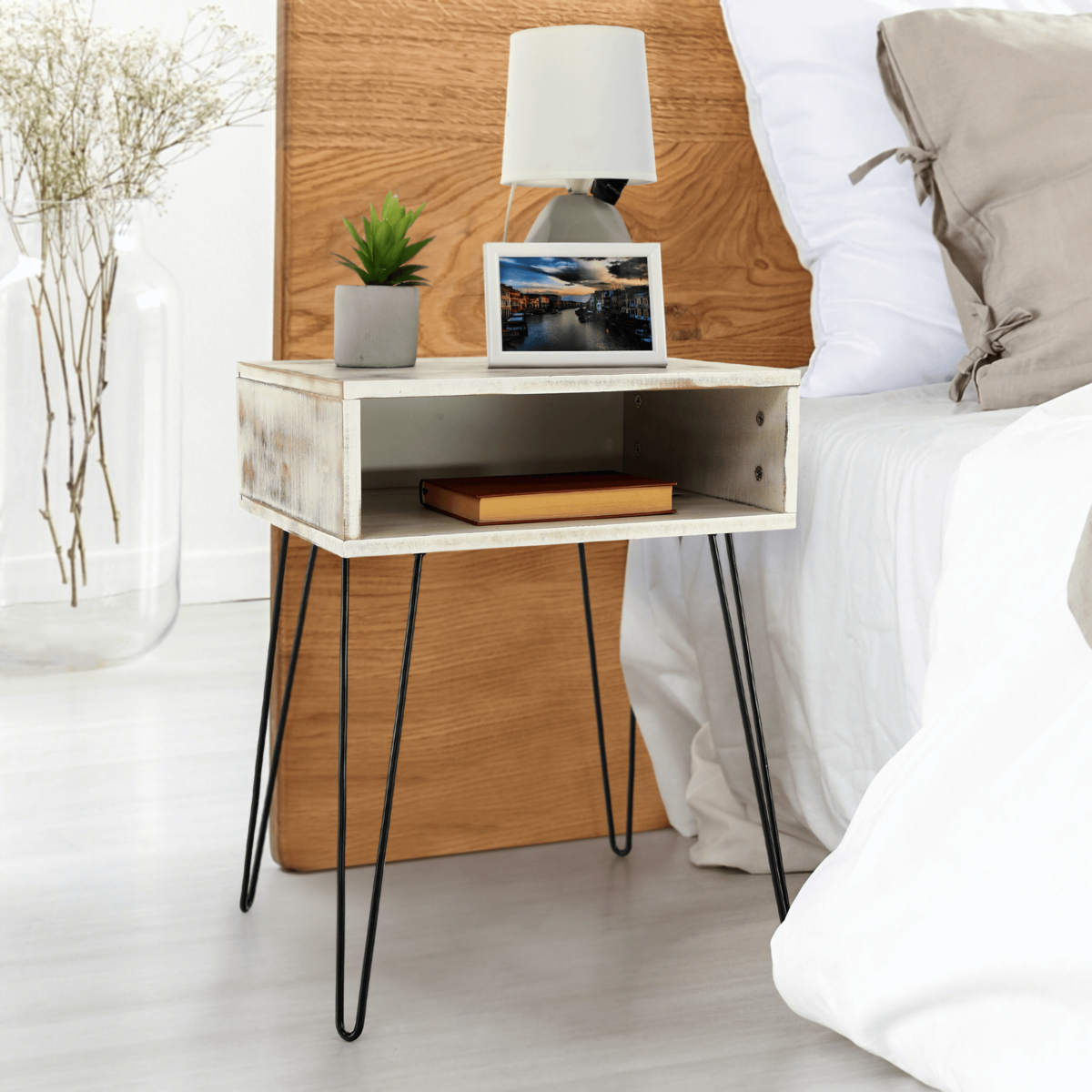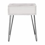 Tento multifunkčný stolík, ktorý zaujme svojim neobvyklým vzhľadom, je určený predovšetkým ako nočný stolík k posteli. Využitie ale nájde aj v predsieni či v obývačke. Jeho očarujúce spracovanie a jedinečný dizajn vám spríjemnia domácu atmosféru. Vyrobený je z lakovanej MDF v bielej farbe. Stabilitu zaisťujú kvalitné čierne kovové nohy.