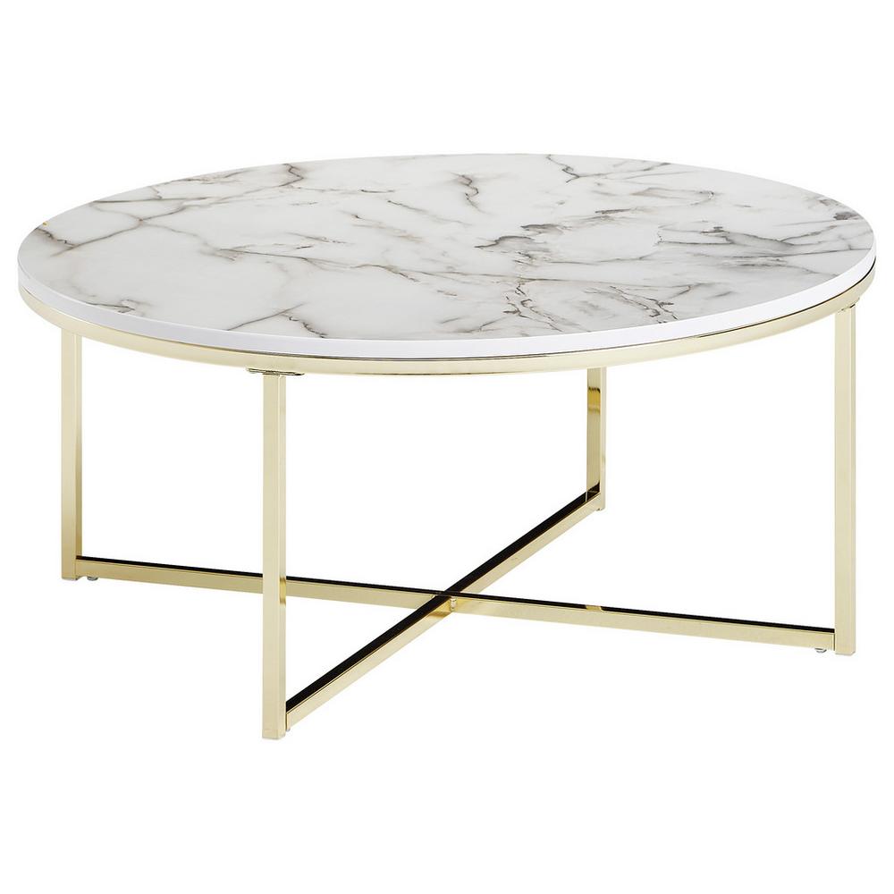 Tento výrobok je k dispozícii IBA ONLINE. Dodanie je zadarmo. Prepracovanosť a extravagancia – tieto dve slová najvýstižnejšie charakterizujú tento moderný konferenčný stolík. Kombinácia hranatých oceľových nôh v zlatej farbe s guľatou doskou z MDF vo vzhľade svetlého mramoru zanecháva trvalý dojem. Stolík disponuje doskou o priemere cca 80 cm a hrúbke cca 15 mm. Približne 36 cm vysoký nábytok tak ponúka dostatok miesta na občerstvenie alebo dekoratívne predmety. Konferenčný stolík má maximálnu nosnosť 10 kg. Tento produkt je k dispozícii v rôznych verziách. Tento tovar je k dispozícii IBA ONLINE, a zároveň je to tovar s doručením formou DROPSHIPPING. Čo to pre Vás znamená? (DROPSHIPPING) – rýchlejšie doručenie