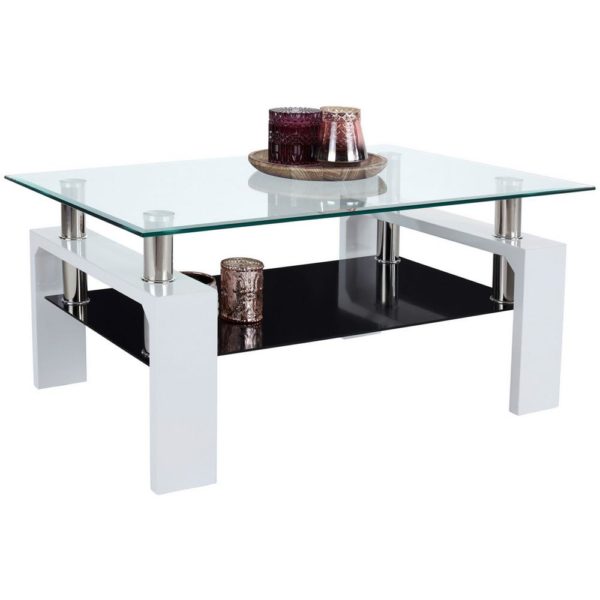 Konferenčný stolík SILVIA je štýlový a zároveň praktický kus nábytku do vašej obývačky. Veľký stôl s rozmermi približne 100 x 45 x 60 cm (Š x V x H) má osem milimetrov hrubú stolovú dosku z číreho skla. Biela sklenená doska police pod ňou …