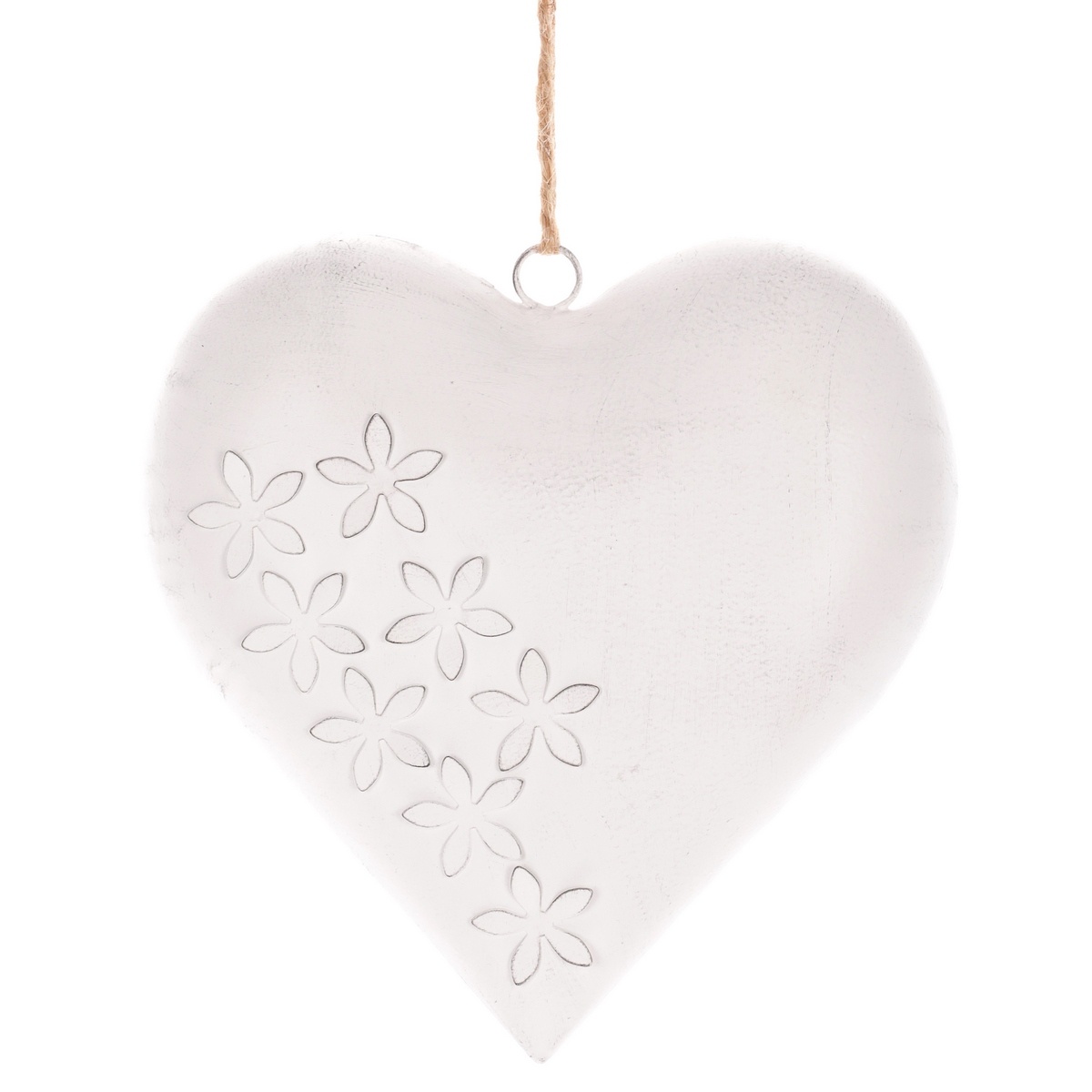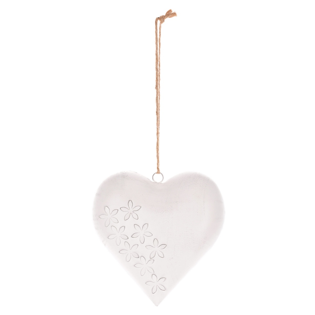 Táto krásna závesná dekorácia v tvare srdca skrášli a zútulní každý domov. Srdce je kovové s bielou povrchovou úpravou s patinou. Súčasťou dekorácie je prírodný povrázok na zavesenie. Veľkosť srdca je 20 x 20 x 4 cm.