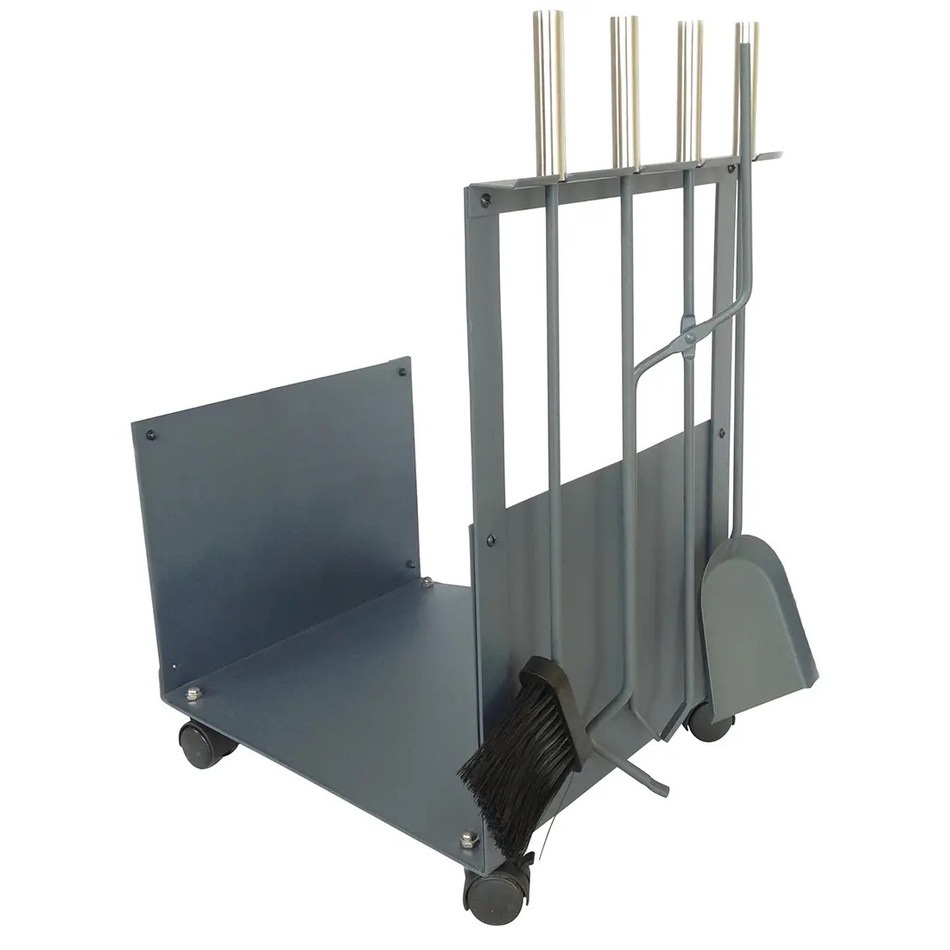 Tento praktický kôš na drevo ku krbu má po strane držiak s náradím. Nájdete tu kutáč, ktorý je užitočný pre manipuláciu so žeravým popolom, metličku, lopatku na zmetenie popola či kúskov dreva a kliešte.