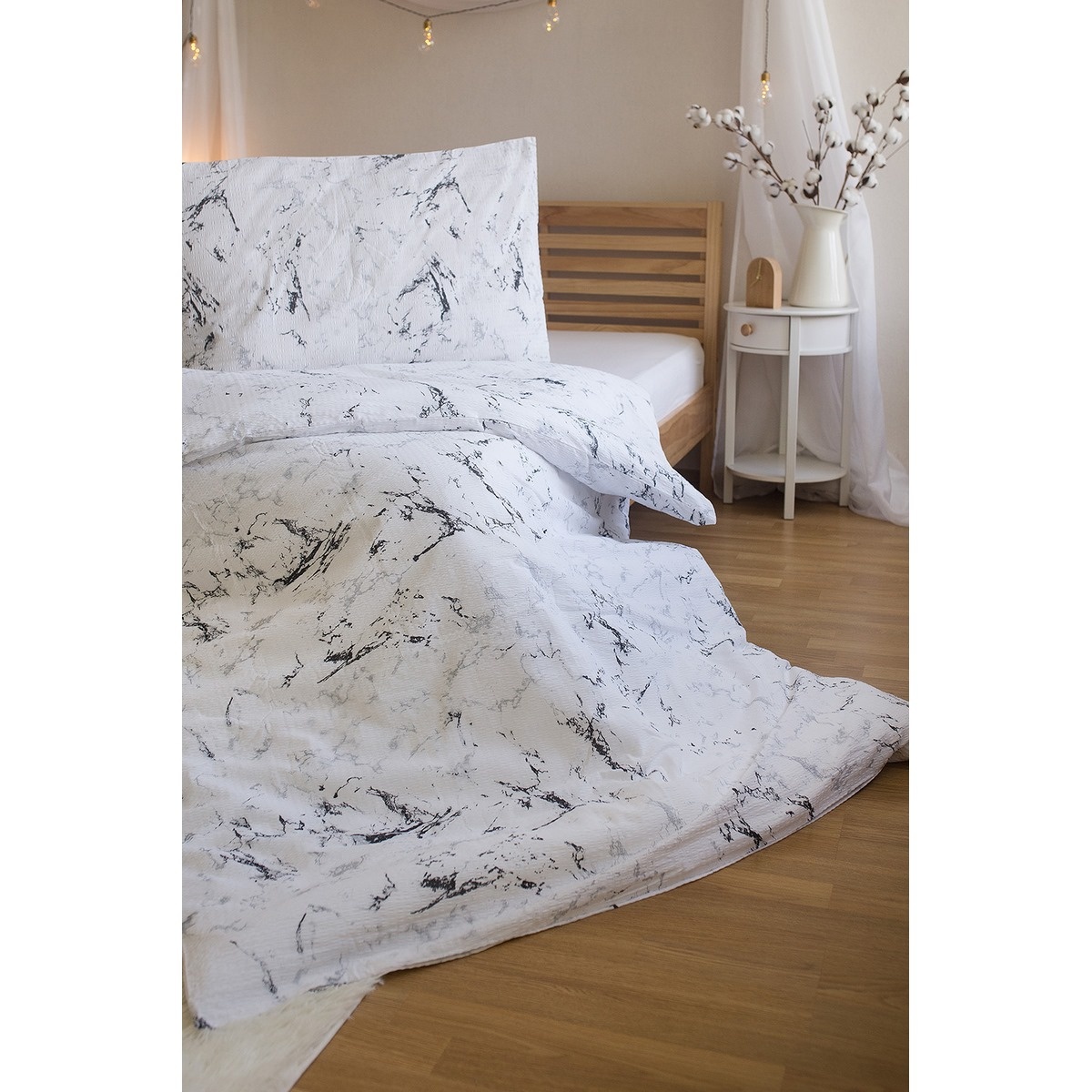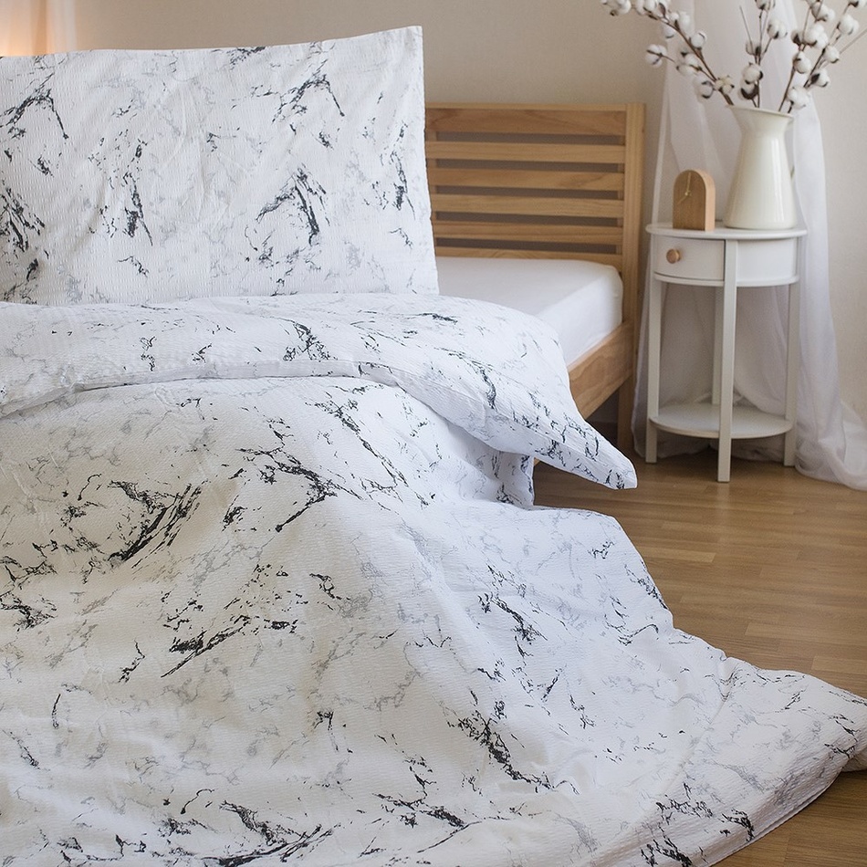 Krepové obliečky v dezéne bieleho mramoru budú originálnou a nadčasovou ozdobou vašej spálne. Obliečky sú vyrobené z kvalitnej bavlny. Obliečky sú z oboch strán rovnaké. Sú opatrené praktickým zipsovým uzáverom.Súprava obsahuje:
