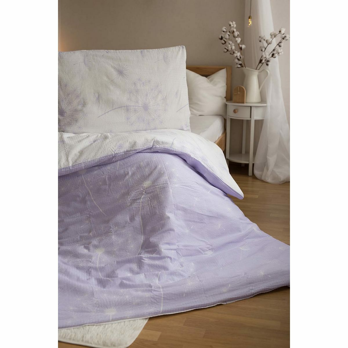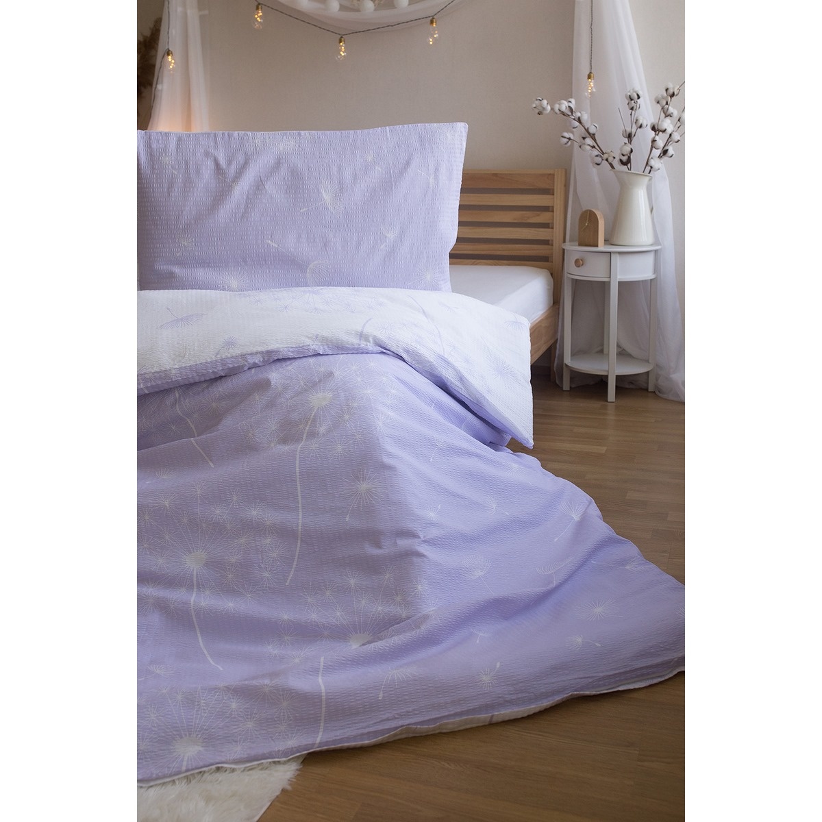 Krepové obliečky s motívom páperia púpavy sú z jednej strany fialové s bielymi púpavami a z druhej strany biele s fialovými púpavami. Obliečky sú vyrobené z kvalitnej bavlny. Obliečky sú z oboch strán rovnaké. Sú opatrené praktickým zipsovým uzáverom. Súprava obsahuje: