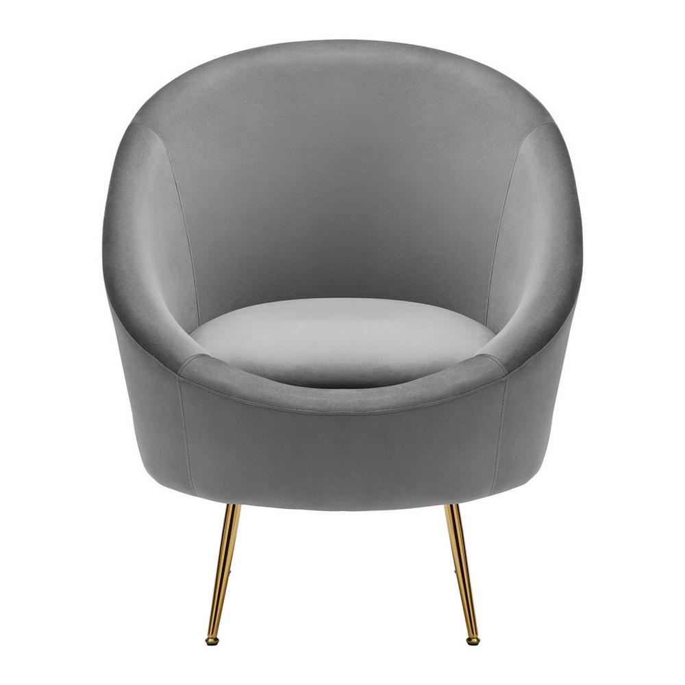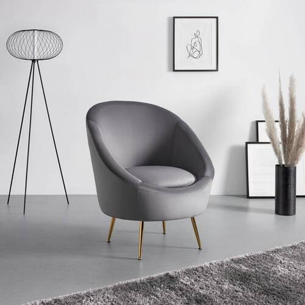 Vneste do svojho domova útulné sedenie s týmto atraktívnym sivým kreslom! Vďaka okrúhlemu vzhľadu a plyšovému zamatovému poťahu zo 100% polyesteru je stolička pútavou v mnohých obytných priestoroch. Kónické nožičky vyrobené z kovu zlatej farby podčiarkujú príťažlivý vzhľad. V našom internetovom obchode sú k dispozícii sivé kreslá a zamatové kreslá s bohatým výberom dizajnov!