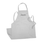 Kuchynská zástera je pekná ochrana odevu pri varení. Vyšité meno alebo iný text urobí zo zástery krásny a originálny darček. Zladiť ju môžete s utierkou v rovnakej farbe a vyšitým textom podľa vašich predstáv.