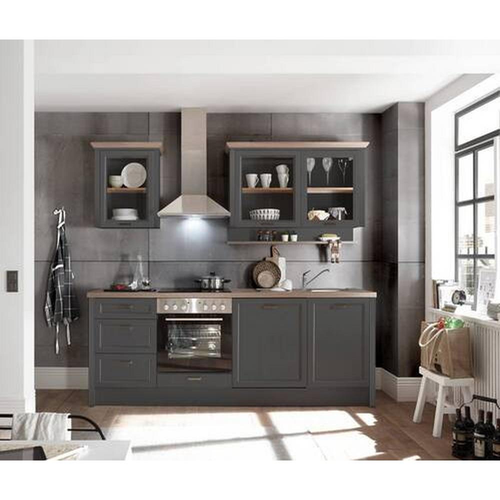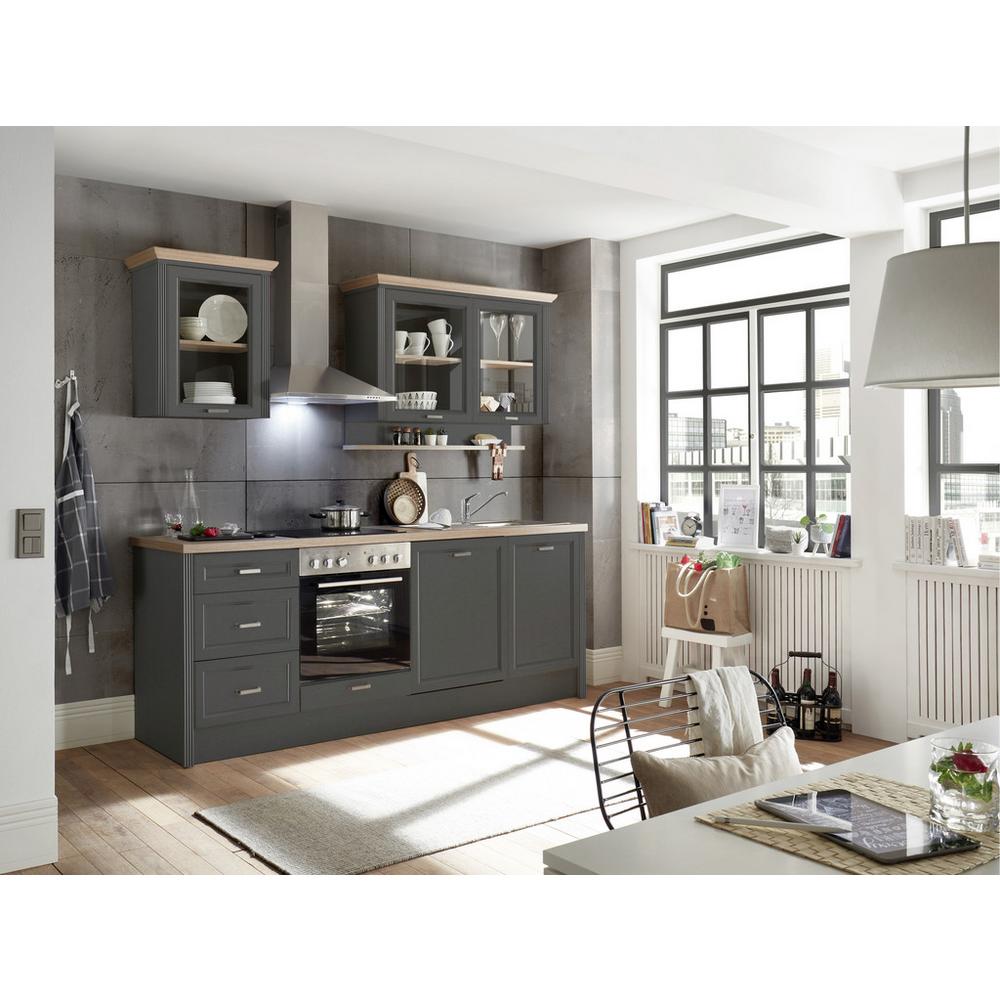 Tento tovar je dostupný IBA ONLINE. Kuchynská linka MELANIE zaujme trendovým vidieckym štýlom v krásnom farebnom prevedení korpusu a predných častí v antracitovej farbe a pracovnou doskou v dubovom prevedení. Dvierka a zásuvky sa otvárajú úchytkami v ladiacej antracitovej farbe. Na pracovnej doske s hrúbkou cca 38 mm a pri pracovnej výške cca 91 cm môžete pohodlne pripravovať svoje obľúbené pokrmy. Spodná časť obsahuje skrinku na drez a dve skrinky na rúru, sporák a umývačku riadu. Pod skrinkou, predpripravenou na rúru, sa nachádza výklopný úložný priestor na plechy na pečenie. Do troch zásuviek môžete uložiť kuchynské náradie, utierky a hrnce. Dve presklené nástenné skrinky sú ideálne na uloženie pohárov alebo tanierov či dekoračného riadu. Táto kuchyňa s rozmermi cca 230 x 228 x 60 cm (Š x V x H) je dodávaná bez spotrebičov, takže si môžete vybrať podľa osobných preferencií. Dve prestavbové skrinky zaistia, že drez a sporák môžu byť bez problémov integrované do kuchyne. Šírka jednotlivých prvkov: závesná skrinka 1: 120 cm závesná skrinka 2: 60 cm spodná skrinka so zásuvkami: 50 cm spodná skrinka na inštaláciu sporáka: 60 cm spodný prvok na inšt
