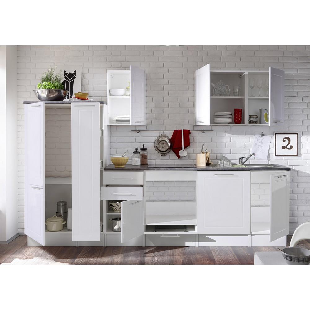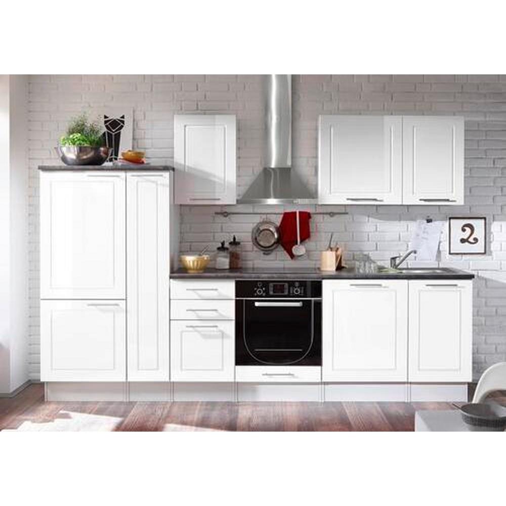 Tento tovar je dostupný IBA ONLINE. Kuchynská linka WELCOME 6 je ladená v príjemnej bielej farbe a boduje premysleným úložným priestorom. Útulný vzhľad moderného vidieckeho štýlu robí z tejto kuchyne miesto pohodlia! Jednoduché frézovanie na bielych čelách vo vysokom lesku dodáva inak veľmi redukovanej kuchyni tradičný nádych. Strieborné madlá a tmavá, antracitová pracovná doska harmonicky dopĺňajú celkový obraz. So šírkou cca 300 cm možno panvice, hrnce a príbory uložiť do troch spodných skriniek a dvoch zásuviek. Kuchynský blok má aj praktickú, úzku vysúvaciu skrinku na potraviny a tri nástenné skrinky. K dispozícii sú prestaviteľné skrinky na chladničku, umývačku riadu a rúru. Mimoriadne praktické: Plechy na pečenie a stojany na koláče možno optimálne uložiť do malého odkladacieho priestoru pod rúrou. S touto kuchyňou si vytvoríte nádhernú vidiecku idylku a zabezpečíte si útulnosť vo svojom vlastnom dome. Každý sa tu bude cítiť pohodlne! Tip: Vaša vysnívaná kuchyňa by mala byť navrhnutá tak, aby vyhovovala najmä vašim osobným pracovným postupom. Dobre si preto rozmyslite, ktoré zariadenia sú pre vás vhodné. Pri tejto kuchyni si môžete ľubovoľne vybrať chladničku, sporák, digestor, umývačku riadu