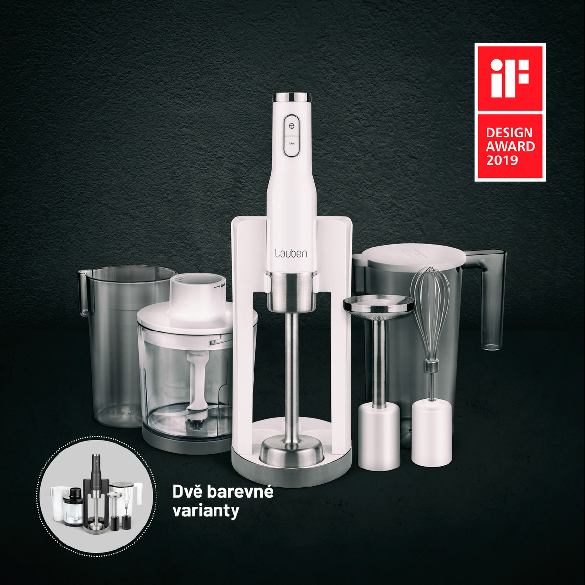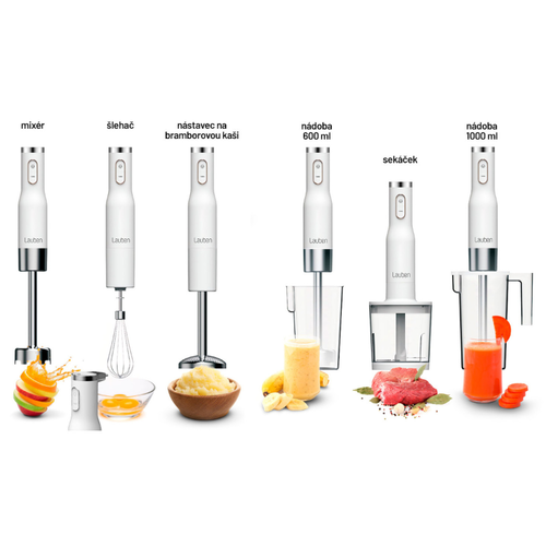 Mixér poháňa silný motor s výkonom 800 W, takže si bez problémov poradí napríklad aj s ľadom do koktailov. Na výber máte z dvoch farebných variantov, obe sú vyvedené v elegantnom a zároveň funkčnom dizajne, o ktorom svedčí prestížne ocenenie IF Design. Mixér je robustný a vďaka ergonomickému tvarovaniu a protišmykovej úprave sa dobre drží. Vďaka špeciálnemu anti-splash tvaru mixovacej hlavice sa nemusíte báť rozstreknutia mixovaných potravín, takže môžete pracovať bez obáv o kuchynskú výmaľbu. Súčasťou mixéra sú dve mixovacie nádoby s protišmykovým dnom, sekacie nádoba a niekoľko nadstavcov, vrátane šľahacej metly alebo špeciálneho nadstavca na prípravu dokonalej zemiakovej kaše. Všetky nadstavce jednoducho uložíte do skladovacieho stojanu, ktorý je súčasťou balenia. S tyčovým mixérom Lauben zvládnete aj náročnejšie kuchárske techniky v priebehu niekoľkých minút. Jednotlivé nadstavce aj nádoby možno navyše umývať v umývačke riadu, takže ušetríte ešte viac času.Príslušenstvo: