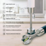 anti-splash design – tvarovanie hlavica mixéra bráni rozstreknutiu mixovaných potravín, nemusíte sa obávať neporiadku v kuchyni
