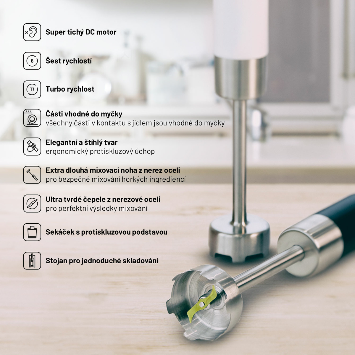 prémiový funkčný dizajn – mixér je robustný, ale napriek tomu elegantný, vďaka ergonomickému tvarovaniu sa dobre drží a ľahko sa s ním pracuje