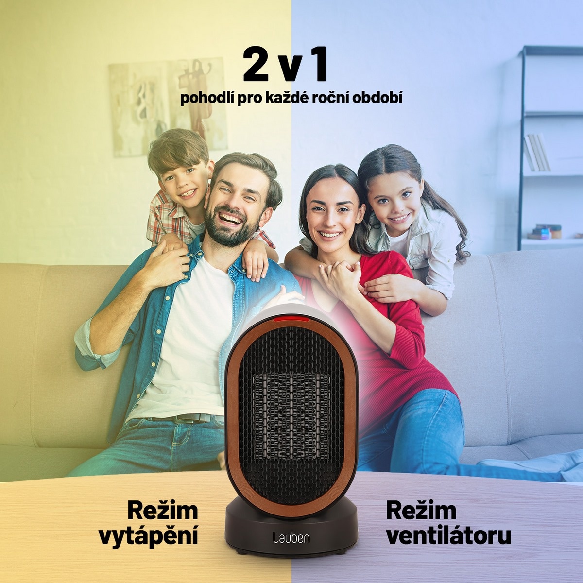Dopriať si príjemné teplúčko, kedykoľvek pociťujete prílišné dotieranie pani zimy, je teraz jednoduchšie, než by sa mohlo zdať. Nemusíte hneď zapínať kúrenie, stačí povolať do akcie Lauben Desk Fan and Heater 2in1 600BB. Tento malý, ale šikovný krásavec s výkonom 600 W ukrýva PTC keramický ohrievač zaisťujúci energeticky efektívny výkon. Zároveň je jeho prevádzka bezpečná, a to aj vďaka poistke proti prehriatiu a prevrhnutiu. Bezlopatkové prevedenie neohrozuje deti ani domácich miláčikov. Bez problémov vykúri až 10 m2 a vie sa natáčať v uhle 45°. S rovnakou vervou sa však púšťa aj do chladenia. Prepnutím na mód vetráka prirodzene prúdením vzduchu ochladíte miestnosť. Avšak riešenie 2v1 v high end Lauben dizajne vás chladnými nenechá.Mini ohrievač Lauben Desk Fan and Heater 2in1 600BB predstavuje skvelé riešenie domov, na chatu aj do kancelárie pre chvíle, kedy si potrebujete trochu prikúriť. Bezpečnú prevádzku zaisťuje PTC keramický ohrievač, ktorý zároveň poskytuje energeticky efektívny výkon. Mód ohrievača poskytuje príjemný teplotný komfort jednoducho a rýchlo.Riešenie 2v1 umožňuje premeniť ohrievač na vetrák jediným tlačidlom. Mód vetráka priestor prirodzene chladí prúdením vzduchu. Jeho bezlopatkové prevedenie sa tak výborne hodí pre rodiny s deťmi a domácimi miláčikmi, pretože je pre nich prevádzka bezpečná.Ohrievač a vetrák v jednom v high end Lauben dizajne ukrýva výkon 600 W, ktorý pokryje až 10 m2. Možnosť natáčania v uhle 45° poskytuje užívateľský komfort, prístroj si nastavíte tak, aby vám to bolo príjemné. Bezpečná prevádzka je zaistená poistkou proti prehriatiu a poistkou proti prevrhnutiu.