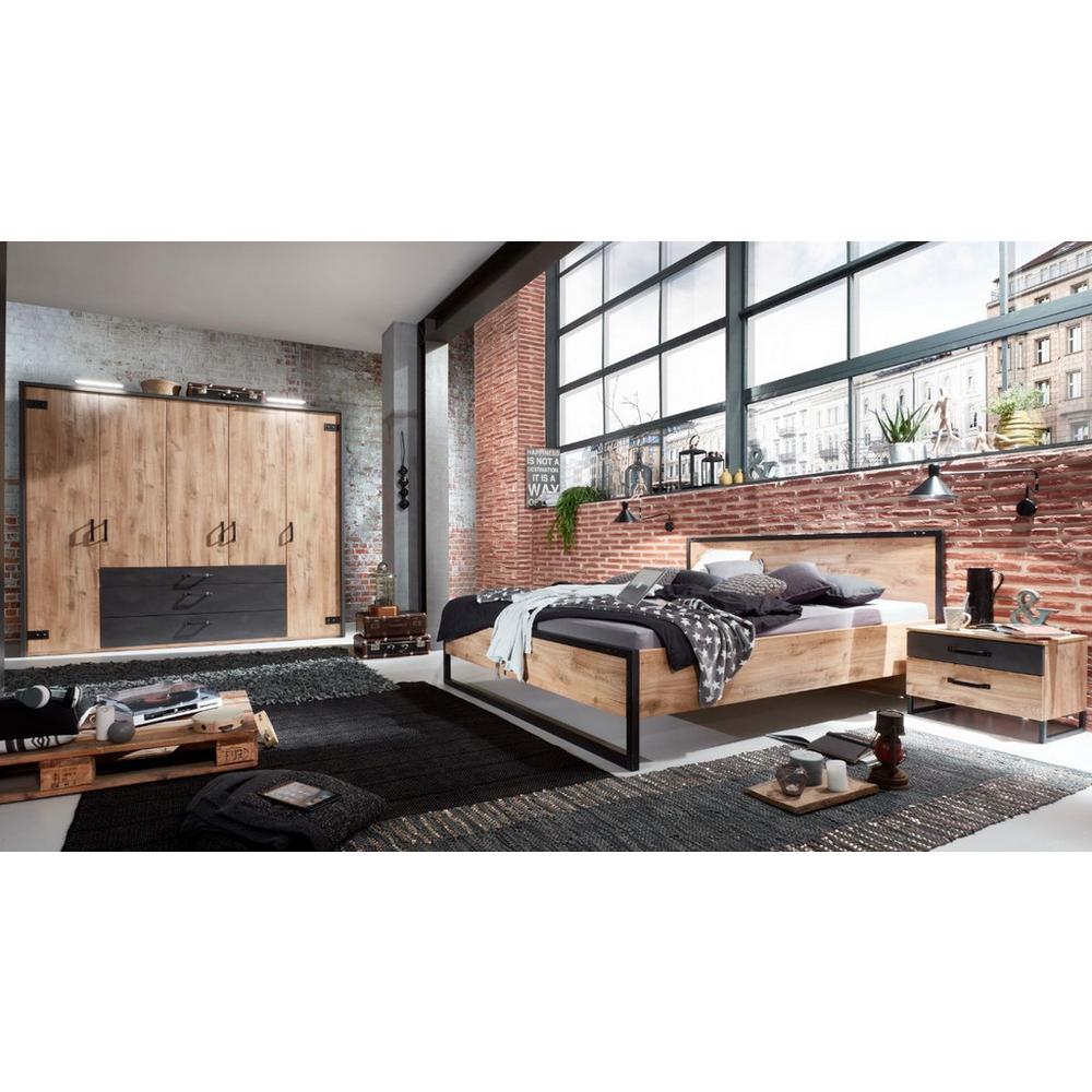 Tento tovar je dostupný IBA ONLINE. Posteľ zo série nábytku do spálne DETROIT ponúka pohodlný priestor na spanie pre dve osoby, s plochou na ležanie okolo 160 x 200 cm (Š x D). S celkovými rozmermi približne 169 x 210 x 94 cm (Š x D x V) je skvelým nábytkom do spálne alebo do izby pre mládež. Posteľ, vyrobená z dreveného dekoru vo vzhľade dubu, sľubuje najvyššiu kvalitu, a preto získala aj certifikát BQ – Alliance for Quality. Vďaka šikovnej kombinácii s prvkami vo farbe grafitu je tento nábytok skutočným pútačom pozornosti, ktorý odhaľuje zmysel pre štýl a náklonnosť k modernosti. Okrem vzhľadu ponúka posteľ DETROIT aj pohodlie a praktické benefity naviac. S výškou nôh asi 15 cm je upratovanie pod posteľou o dosť jednoduchšie. Tiež vysoké záhlavie je veľkým plus pre milovníkov večerného čítania či filmových fanúšikov. Výška rámu postele je asi 35 cm, celková výška ležania bude závisieť od výšky zvoleného matraca, ktorý tak ako aj rošt, nie je súčasťou balenia. Séria DETROIT zaujme nekompromisnými líniami a prepracovanou farebnou kombináciou grafitových a dubových farieb. Pre obzvlášť útulnú a harmonickú spálňu je vhodné kombinovať jednotlivé kusy nábytku z tejto série. Objavte aj ostatné postele z kategórií