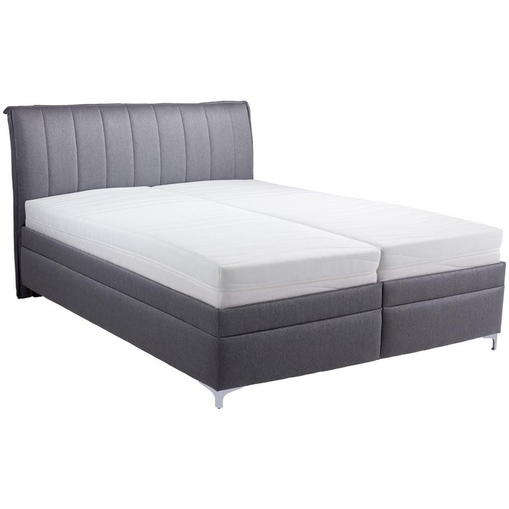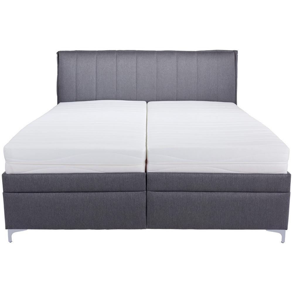 Čalúnená posteľ tmavosivej farby ponúka útulné miesto na spanie na ploche s rozmerom cca 180 x 200 cm a s výškou lôžka cca 65 cm. Vďaka elegantnému poťahu zo syntetických vlákien a čalúnenému čelu s prešívaním sa dá posteľ ľahko kombinovať s viacerými štýlmi nábytku. Posteľ je postavená na štyroch pochrómovaných nožičkách, ktoré zaisťujú potrebnú stabilitu a dotvárajú celkový dizajn. Rošt s 28 lamelami v dvojitých puzdrách má tri zóny ležania, a poskytuje tiež manuálne nastavenie v častiach hlavy a nôh. Matrace s výškou asi 21 cm majú jadro z polyuretánovej peny so strednou tvrdosťou – H3. Poťah je odnímateľný a je možné ho prať v práčke. Posteľ TERAMO disponuje aj úložným priestorom, ktorý sa nachádza pod roštom. Celkový rozmer postele je približne 193 x 122 x 224 cm (Š/V/H). Zariaďte si spálňu útulne a moderne s touto skvelou posteľou! Upozorňujeme, že vyobrazené lôžkoviny a doplnky nie sú súčasťou dodávky. Objavte aj ostatné