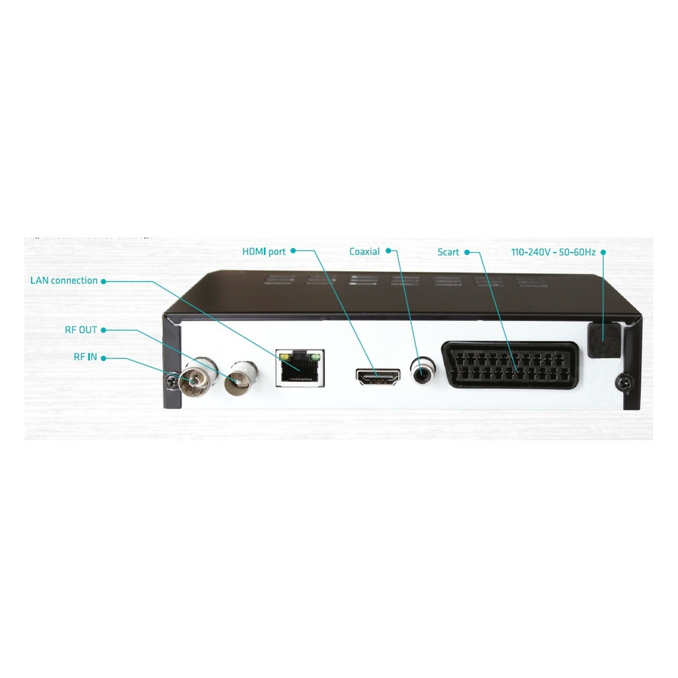 I/O porty: RF in, Loop Through, HDMI, SCART, USB input