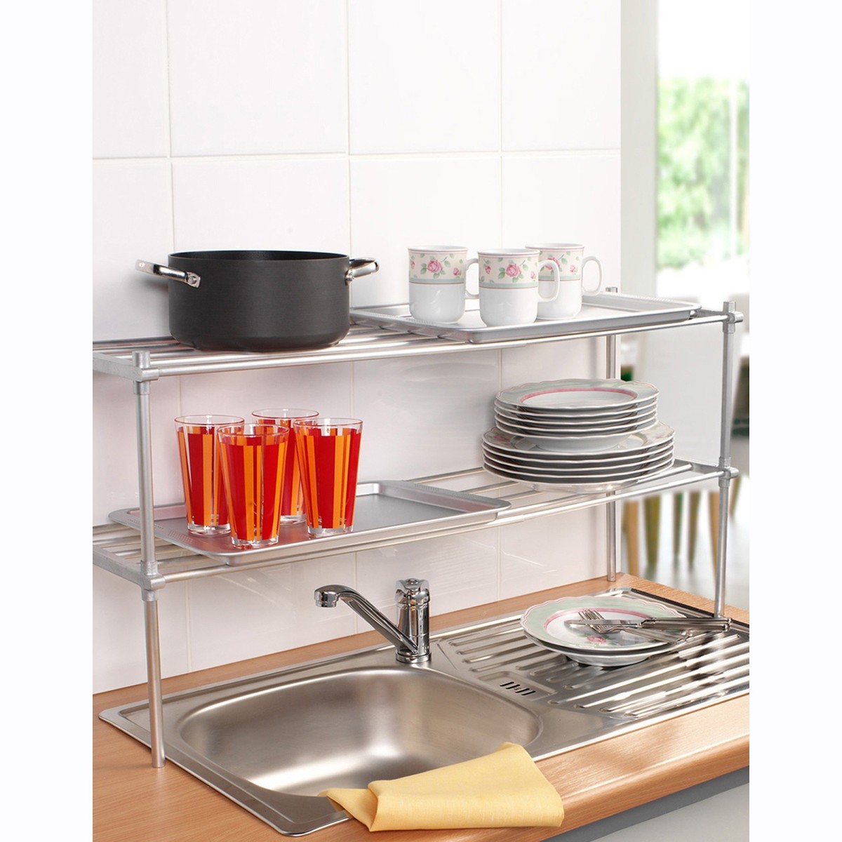 Pozdĺž drezu, v skrini alebo na pracovnej doske, táto nastaviteľná polica ponúka dodatočný úložný priestor. Stabilná. Je možné ju stohovať s jednou alebo viacerými rovnakými policami. Nastaviteľná, prispôsobí sa Vášmu priestoru. 1 úroveň úložného priestoru. V ponuke kusovo. Cca 30 x 25 cm. Dĺžka 52 až 80 cm. Hliník a plast.