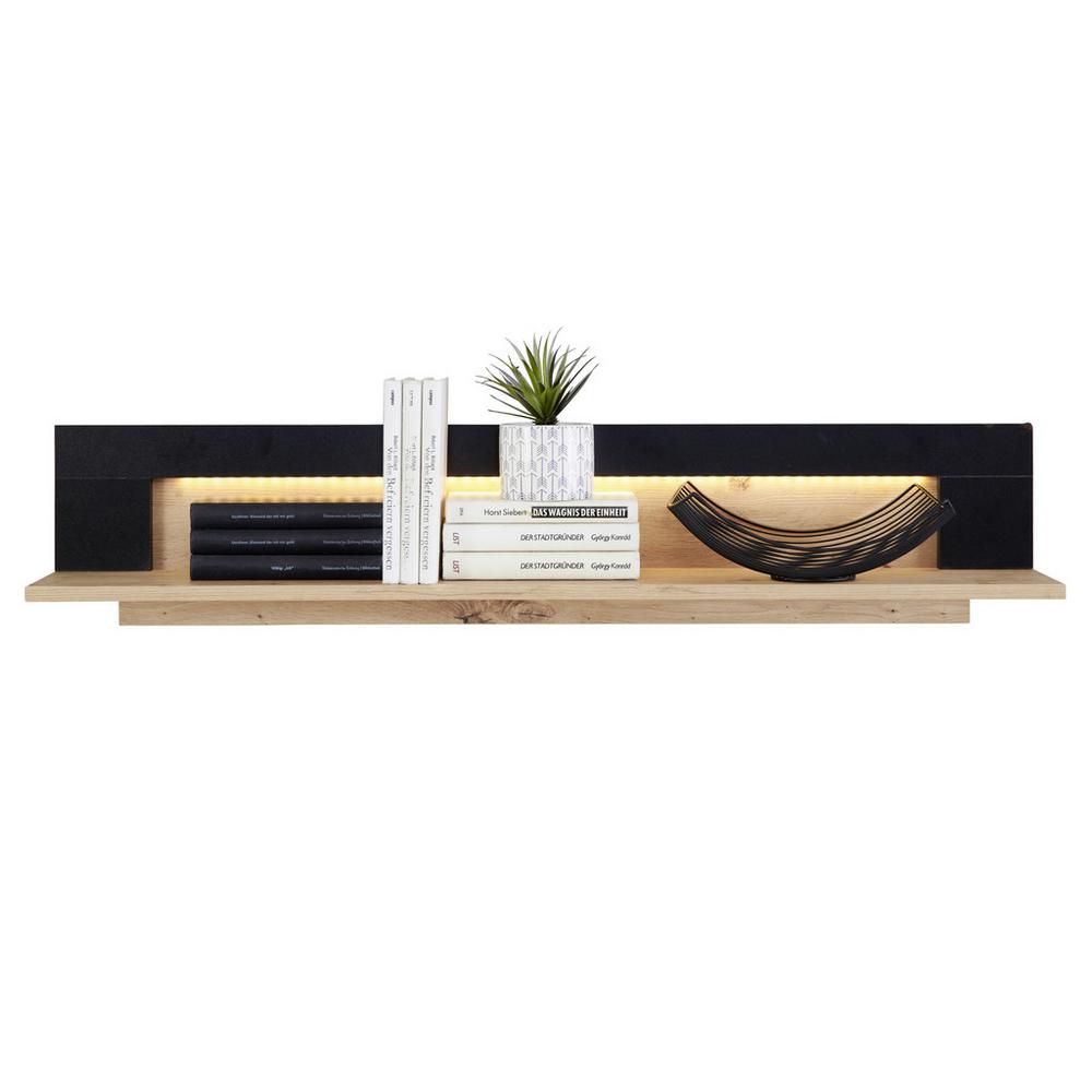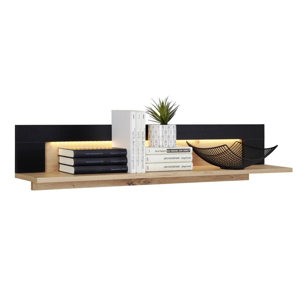Táto nástenná polica zo série NYON zaujme svojím nadčasovým dizajnom s jasnými líniami a poskytne ďalší úložný priestor v obývacej izbe. Polica, s rozmermi približne 110 x 23 x 19,6 cm (Š x V x H), kombinuje dubový dekor s perlovo čiernou farbou. Pre väčšiu odolnosť je jej povrch potiahnutý melamínovou živicou. Polica ponúka veľa miesta na knihy alebo predmety, ktoré by ste radi prezentovali vo svojej obývacej izbe. Vďaka vstavanému LED osvetleniu možno policu použiť napríklad ako dekoratívny prvok nad televíziou. Ďalší nadčasový nábytok zo série NYON nájdete v našom internetovom obchode!