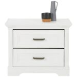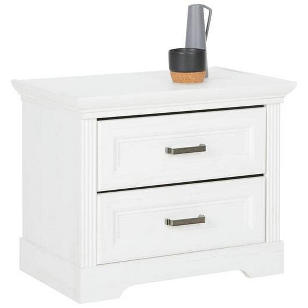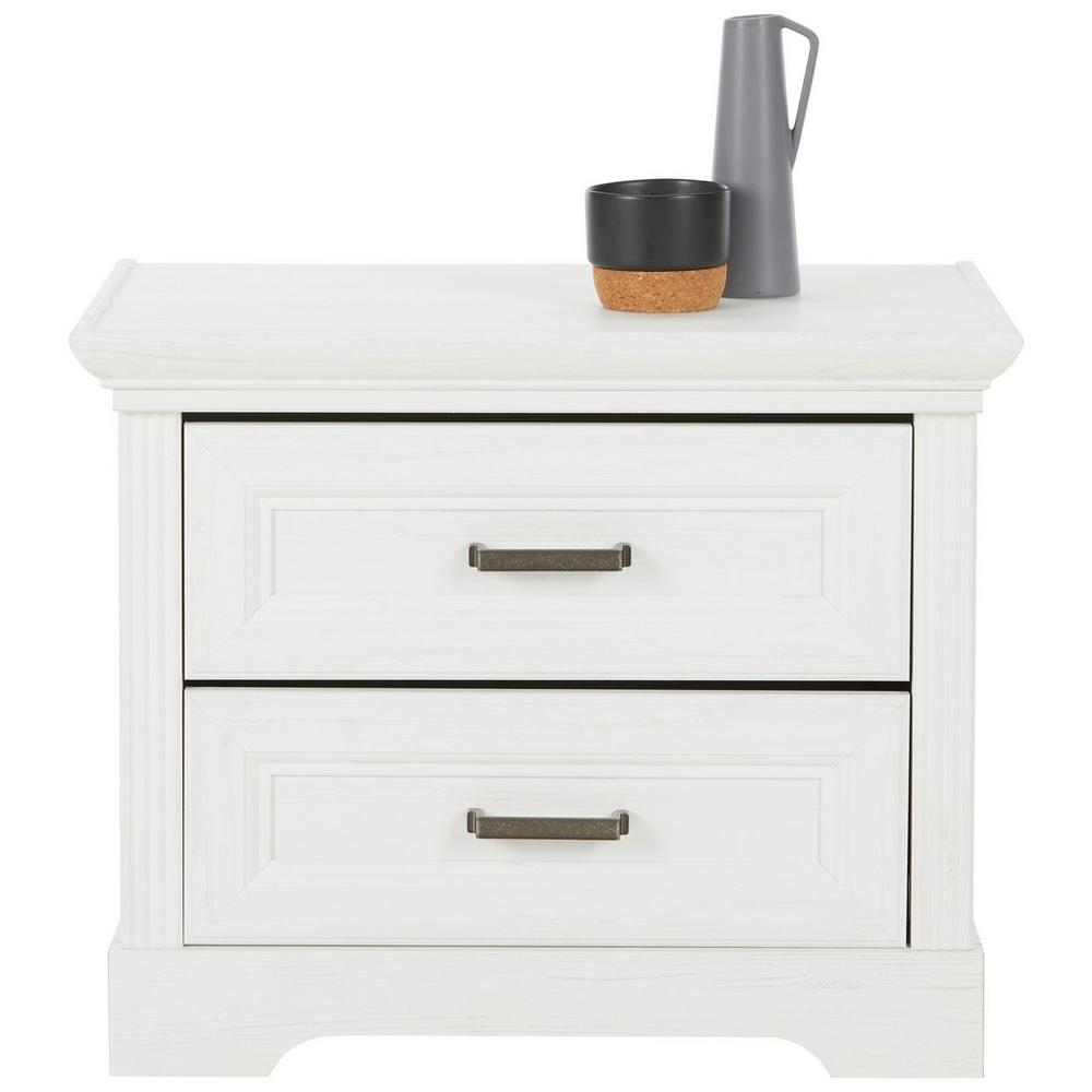 S nočným stolíkom MARILOU budete mať všetky vaše veci vždy poruke, a naviac vám prinesie skvelú atmosféru do vašej spálne. Nočný stolík má rozmery približne 64 x 54 x 41 cm (Š x V x H) a je vyrobený v kombinácii HDF a MDF dosiek, s bielym dekorom borovice Anderson. Stolík má krásne prepracované frézovanie a úchytky v niklových farbách, ktoré dokonale dopĺňajú dizajn vo vidieckom štýle. Čo sa úložného priestoru týka, dve zásuvky ponúknu miesto na knižky, krížovky, napájacie kábely a všetko, čo chcete mať pri posteli poruke. Vrchná odkladacia plocha ponúka priestor na nočnú lampu aj dekoráciu. Nočný stolík MARILOU je súčasťou rovnomennej série do spálne v krásnom vidieckom štýle. Kombinujte skrine, posteľ aj komodu, a vytvorte si úžasnú spálňu snov! Pozrite si aj naše produkty z kategórie: biele nočné stolíky