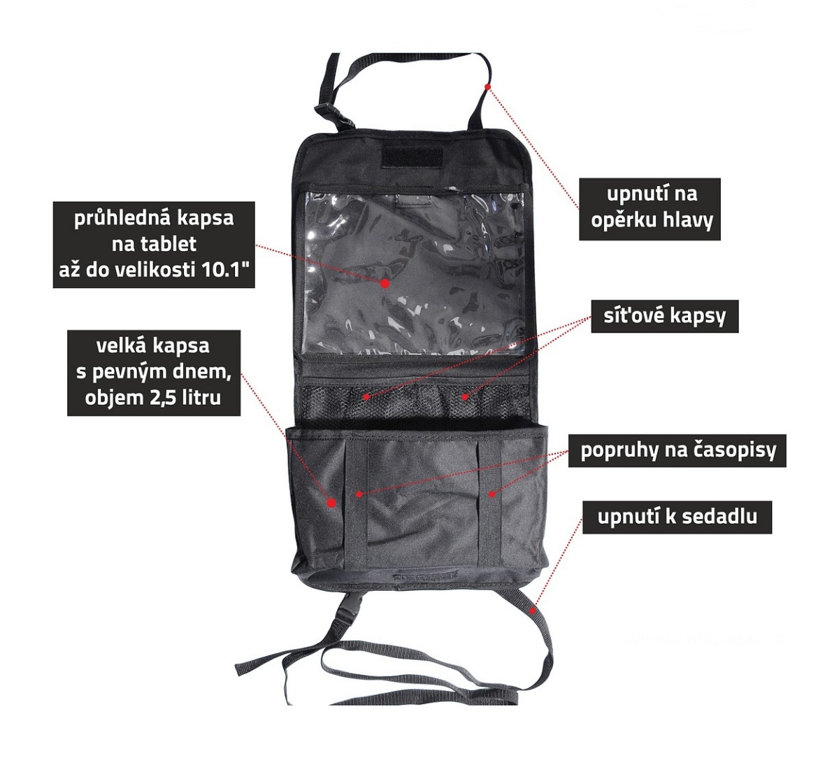 Organizér na predné sedadlo TABLET slúži na pripevnenie na zadnú stranu predného sedadla. Je vybavený celým radom vreciek a jedným veľkým priehľadným vreckom, do ktorého zasuniete tablet až do veľkosti 10.1 . Fólia umožňuje ľahké ovládanie …