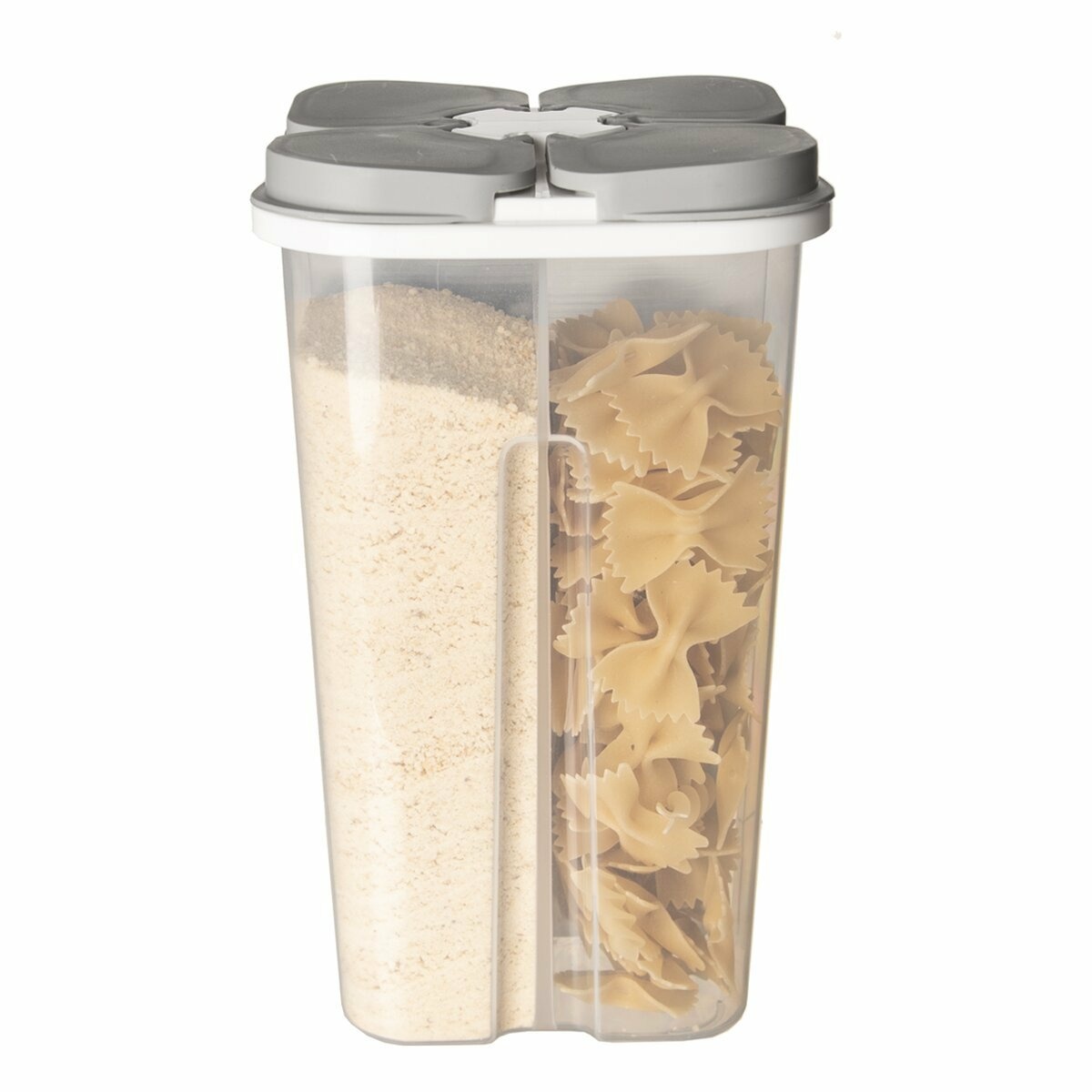 Niekedy je v malých kuchyniach a kuchynských kútoch problém s dostatkom miesta. Zvlášť v malých bytoch, na chalupách, v karavane či kempe sa môže hodiť šikovná vyššia dóza z PP plastu, ktorá má 4 oddelené sekcie na uloženie rôznych surovín. Múky, cukru, strúhanky, drobných cestovín a zavárok do polievky, ale aj strukovín, raňajkových cereálií či sušeného ovocia a zeleniny.Pohodlné dávkovanie umožňuje praktické viečko, takže stačí odklopiť iba tú sekciu, ktorú potrebujete. Objem každej sekcie je cca 0,64 l.Hodí sa aj v dielni na rôzne drobnosti, v detskej izbe na korálky a drobné stavebnice atď.Možno ju použiť bez viečka aj v mikrovlnnej rúre (bez viečka) a umývať v umývačke.