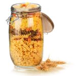 Sklenená patentná dóza so silikónovým tesnením a drôteným uzáverom. V potravinovej skrinke alebo na poličke prehľadne uložíte šošovicu, hrach, ryžu, múku, krupicu, cestoviny, kávu, cukor … Uložené potraviny nestrácajú arómu. Materiál: …