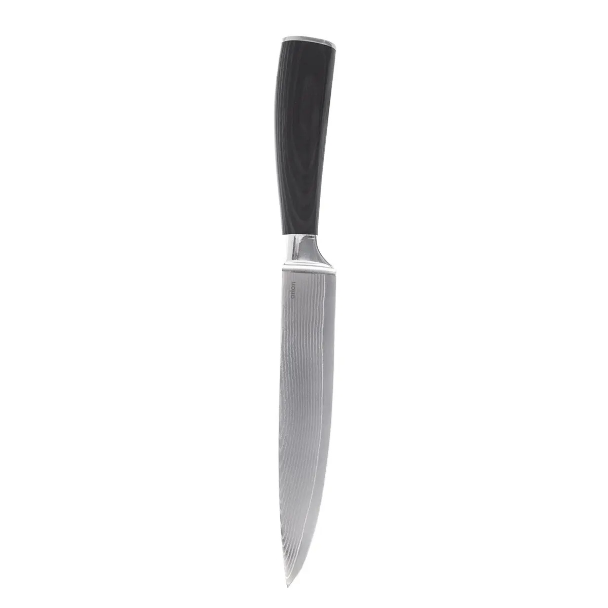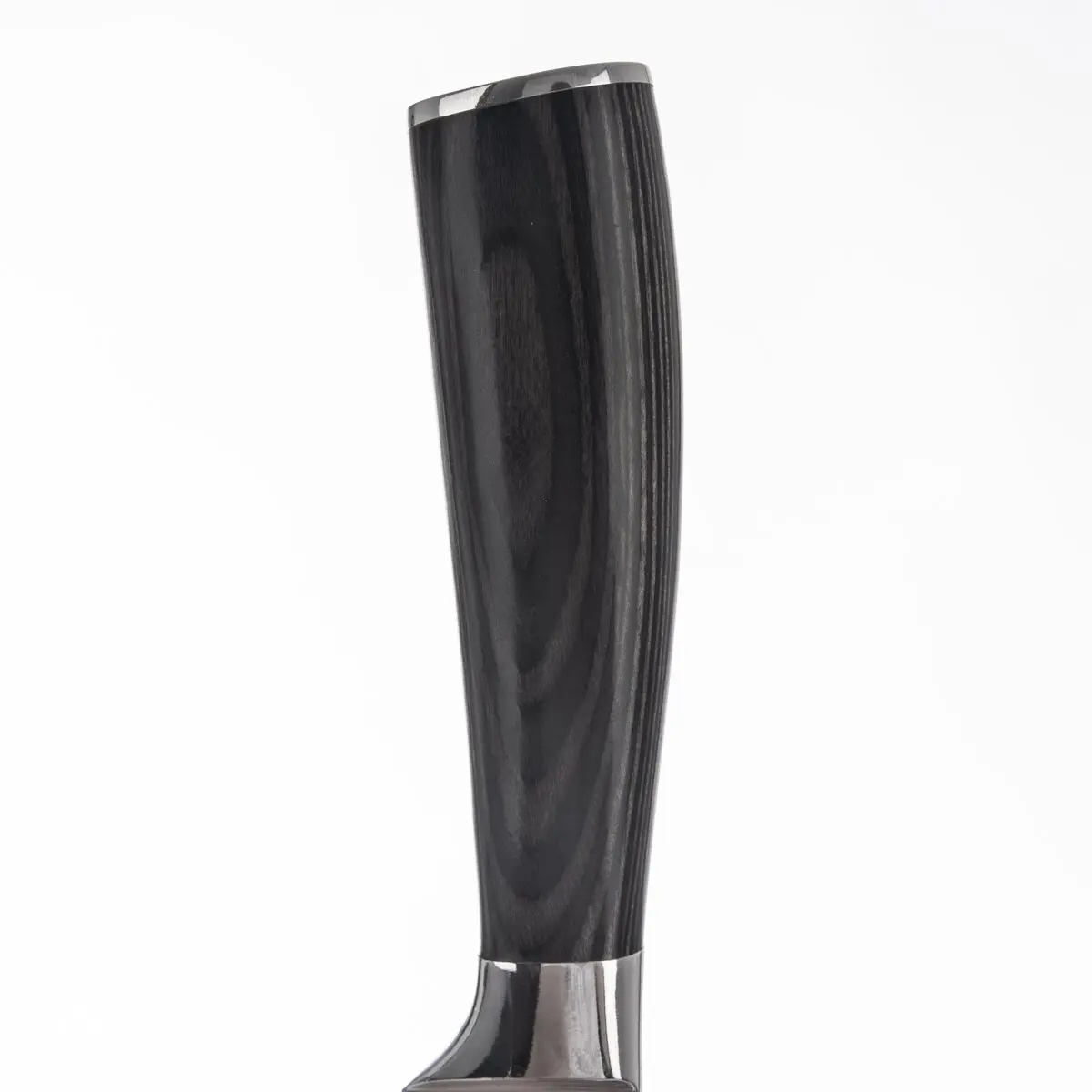 Tento unikátny a vysoko kvalitný nôž z damaškovej ocele s čepeľou 17,5 cm je určený na profesionálne aj domáce použitie. Rukoväť je z pakka dreva, ktoré je vysoko odolné voči mechanickému opotrebovaniu aj vlhkosti.Nôž má celkovú dĺžku 30 cm a ostrie 17,5 cm. Jeho čepeľ je vyrobená z kvalitnej 67-vrstvovej damaškovej ocele (tvrdosť 60 HRC – podľa Rockwella). Damasková oceľ je jednotkou v použití pri výrobe kvalitných nožov. Vzniká z 2 ocelí rôzneho zloženia, ktoré sú zahrievaním spojené do jedného celku tak, že vznikne jedinečná štruktúra čepele s vynikajúcimi vlastnosťami. Damašková oceľ nielen, že tvorí nádhernú kresbu na čepeli noža, ale je aj tvrdá, odolná voči opotrebovaniu, húževnatá, vysoko stabilná a má dlhú životnosť. Krájanie je presné a dokonalé, či už sa pustíte do spracovania a porciovania mäsa, krájania ovocia, zeleniny, byliniek či pečiva.Rukoväť noža je vyrobená z pakka dreva, čo je tlakovo spracovaný kompozit dreva a živice, ktorý je stabilný, tepelne a vlhkostne odolný aj voči mechanickému opotrebovaniu.Nôž stačí po použití umyť v teplej vode so saponátom, opláchnuť a osušiť, nie je vhodný do umývačky riadu. Pozor, nôž je veľmi ostrý, používajte iba na krájanie potravín. V prípade nutnosti nabrúsenia ostria použite kuchynskú brúsku či ocieľku.