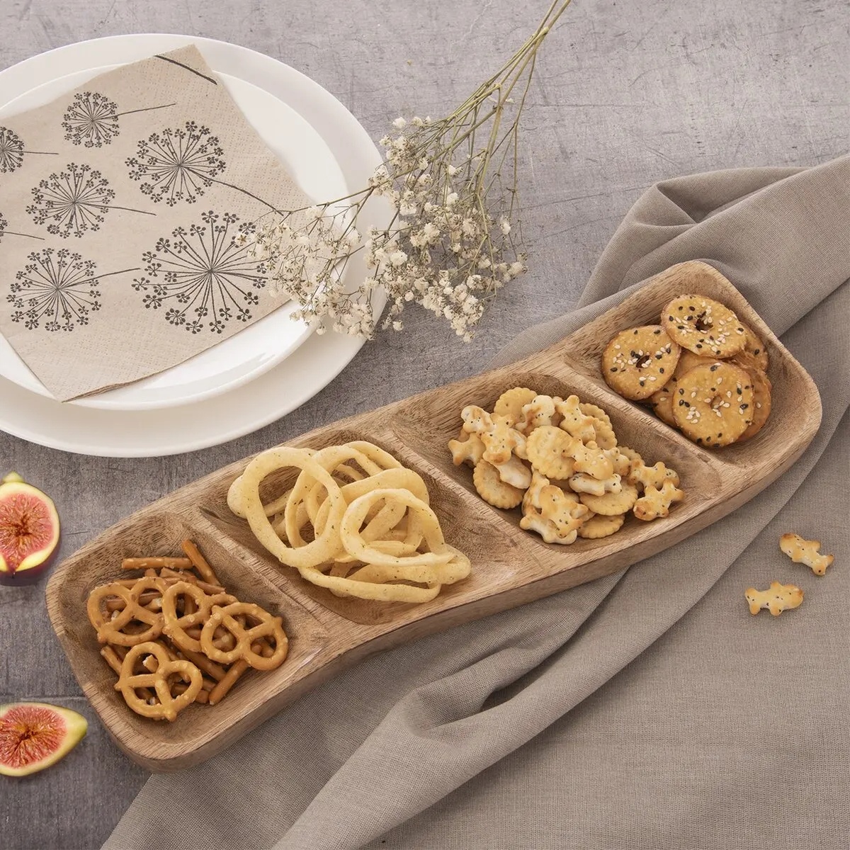 Delená servírovacia miska je vyrobená z mangového dreva a zaujme atypickým nepravidelným tvarom. Je ako stvorená na podávanie orieškov, sušeného ovocia, drobných krekrov a sušienok i cukríkov či praliniek.Samotná je peknou dekoráciou, je …