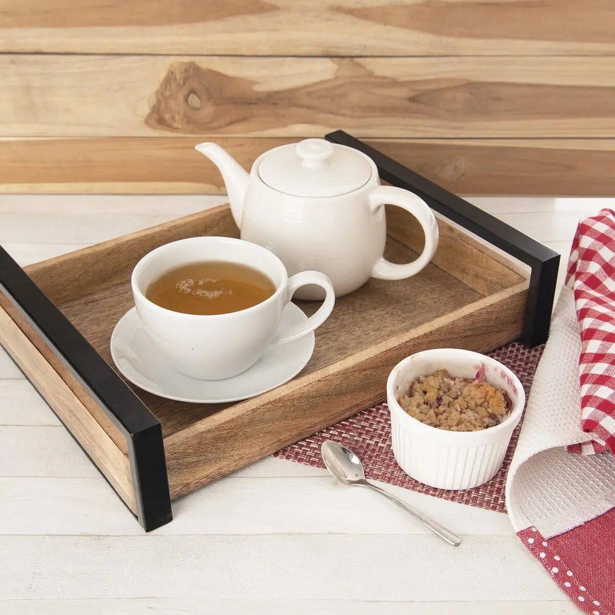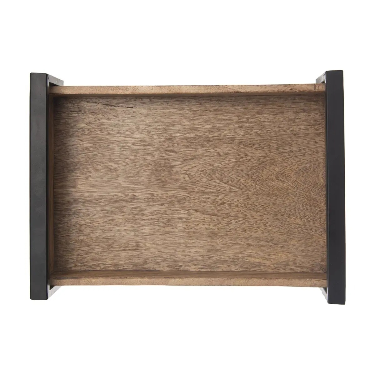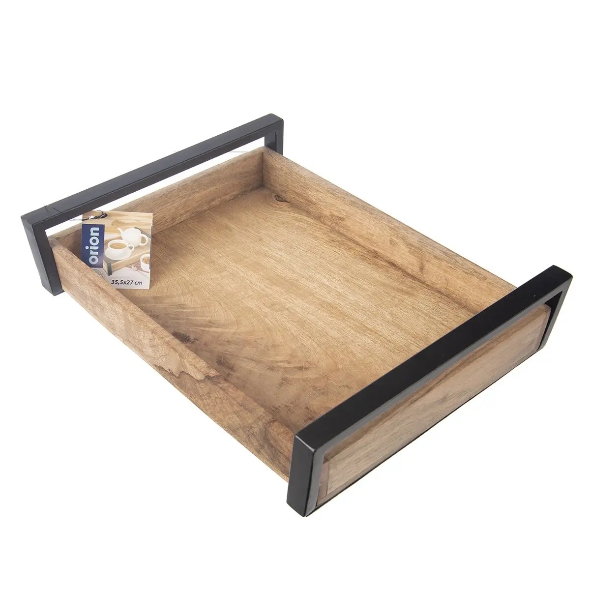 Drevená tácka Mango s čiernymi kovovými bokmi slúžiacimi ako držadlá, veľkosti 35,5 x 27 x 8 cm, je ideálna na servírovanie občerstvenia i nápojov.Servis so všetkým, čo k tomu patrí. Dobrú kávičku, čaj, domáci koláč alebo drobné zákusky …