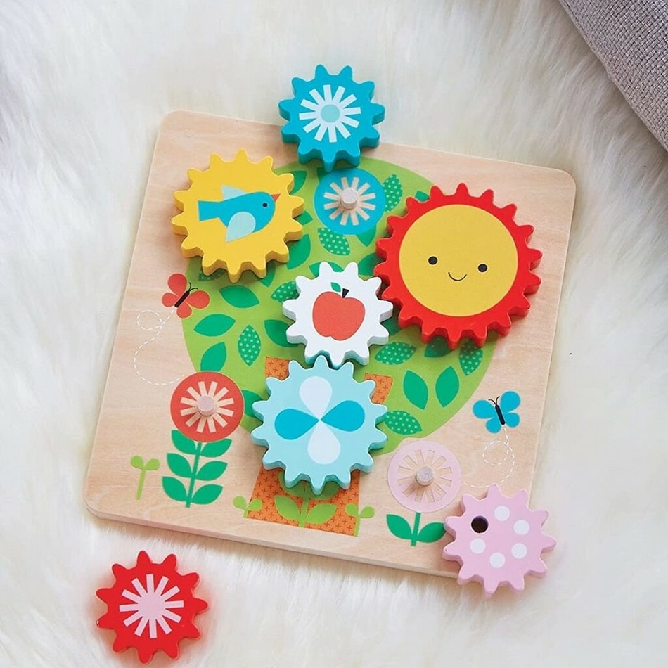 Klasické puzzle s ozubenými kolieskami. Preskúmajte možné kombinácie a usporiadajte robustné a pútavo spracované kolieska správne. Dieťa pri hre rozvíja logiku, jemnú motoriku, koordináciu a rozpoznávanie farieb. Hračka obsahuje: základňa a 7 koliesok.