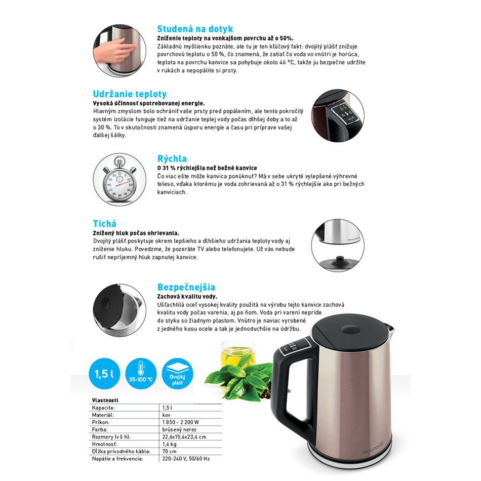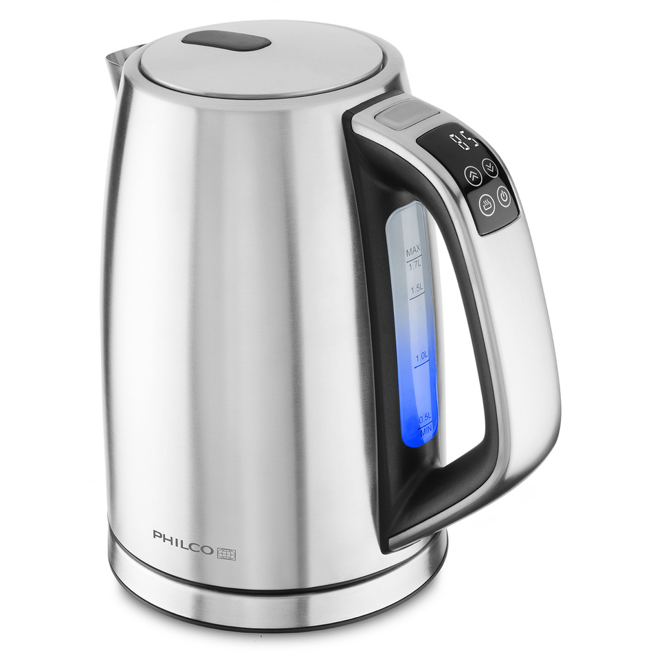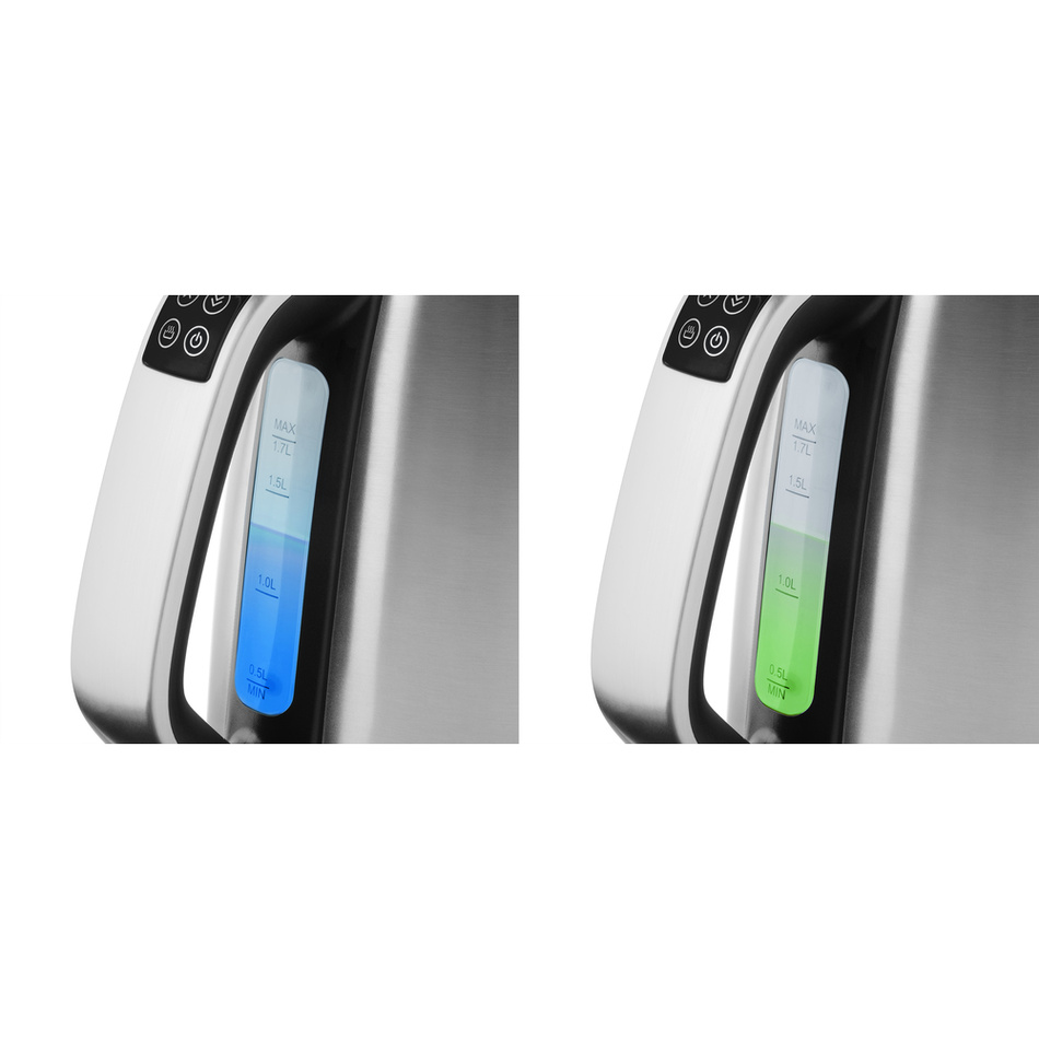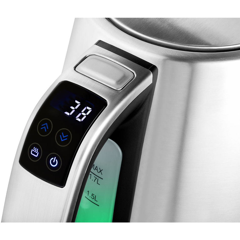 Varná kanvica v nehrdzavejúcom prevedení s príkonom 2200 W a objemom 1,7 litra je vybavená ovládaním teploty od 30 do 100 °C a LED displejom pre presné zobrazenie aktuálnej teploty s funkciou prevarenia vody pre jej sterilizáciu.