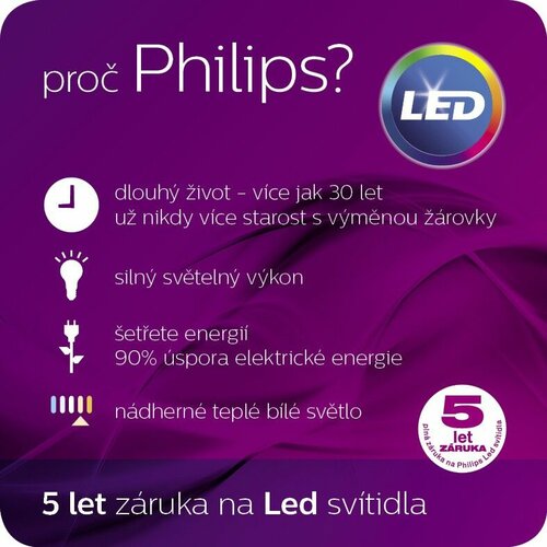 Nástenné svietidlo s pohybovým IR senzorom Yarrow z kolekcie moderného osvetlenia značky Philips je určené na osvietenie vonkajších priestorov vďaka vysokému krytiu IP44, ktoré ho chráni pred vlhkosťou a striekajúcou vodou. Jeho originálny dizajn skvele doplní vašu záhradu, terasu či balkón.Svietidlo je zhotovené z odolného hliníka s čiernou povrchovou úpravou doplnenou o biely plastový difúzor, ktorý je zo svojej polovice vkusne zakrytý. Svit zaisťuje integrovaný LED zdroj s príkonom 1 x 6 W so svietivosťou až 600 lm a teplotou chromatickosti 2700 K. Intenzitu nie je možné stmievať. Senzor je umiestnený v dolnej časti svietidla.Celkové rozmery sú 21,4 x 21,4 x 7,8 cm. Je určené na napájanie zo siete na 220–240 V a vzťahuje sa naň predĺžená záruka 5 rokov (2 roky na svietidlo + 3 roky na LED modul).