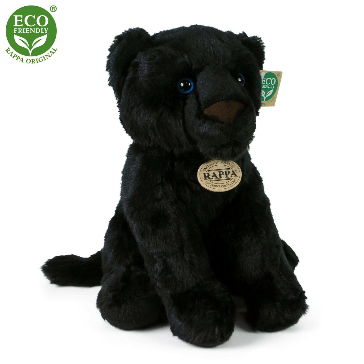 Plyšový leopard je ručne ušitý z vysoko kvalitného, jemného plyšu, a vďaka tomu vyzerá ako živý. Tento sediaci čierny leopard meria 30 cm. Pre svoju roztomilosť sa stáva vítaným spoločníkom nielen do každej detskej izbičky. Je súčasťou exkluzívnej kolekcie plyšových hračiek RAPPA.Tá sa rozhodla ísť zelenou cestou čo najmenej zaťažujúcou životné prostredie – cestou ECO-FRIENDLY. Výplň plyšovej hračky je vyrobená z recyklovaných PET fliaš. Tento materiál je úplne bezpečný, na omak nerozoznateľný od štandardnej výplne a plne atestovaný pre bezpečnosť aj tých najmenších.