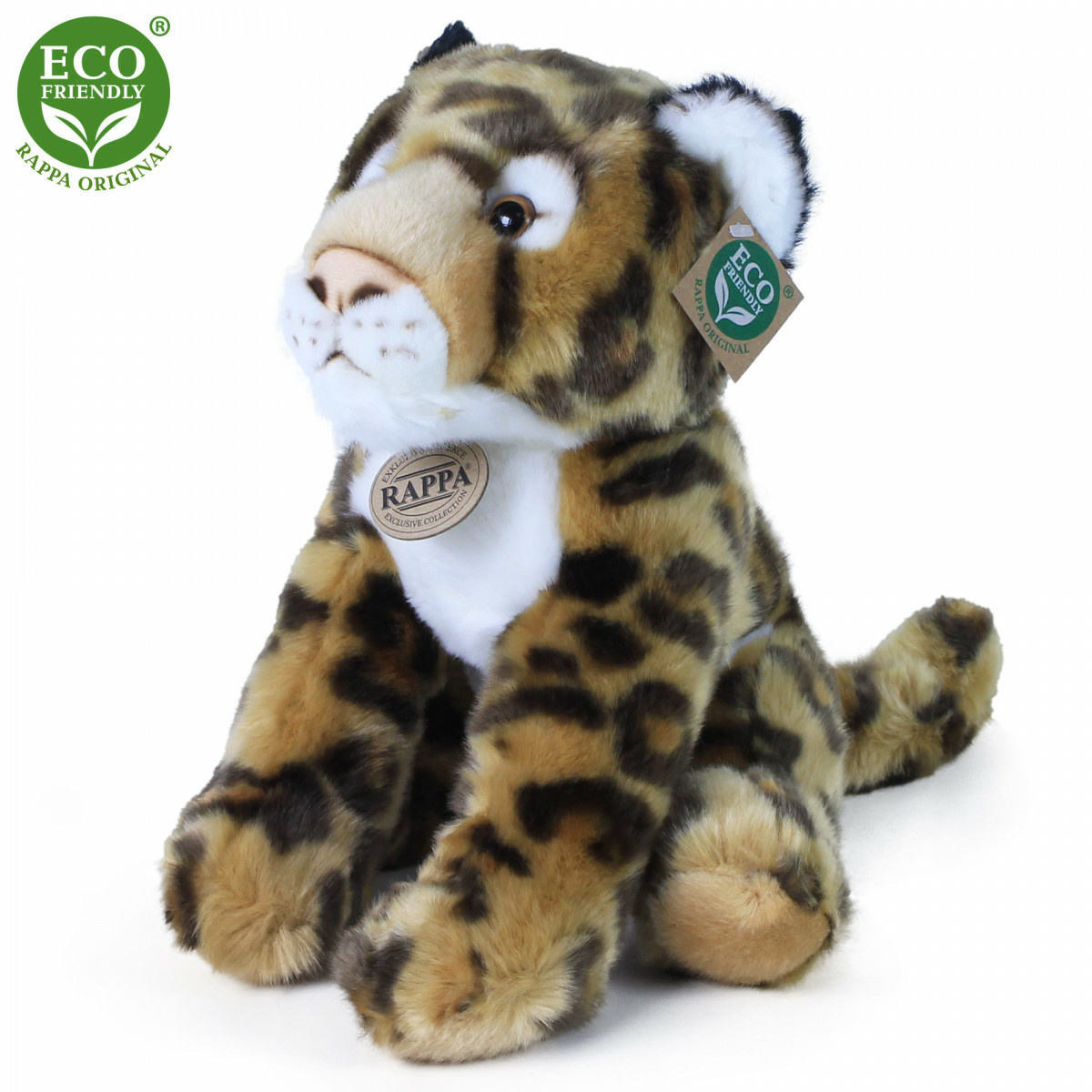 Plyšový leopard je ručne ušitý z vysoko kvalitného, jemného plyšu, a vďaka tomu vyzerá ako živý. Tento sediaci leopard meria 30 cm. Pre svoj roztomilý výraz sa stáva v akejkoľvek chvíli vítaným spoločníkom. Je súčasťou exkluzívnej kolekcie plyšových hračiek RAPPA.Tá sa rozhodla zelenou cestou čo najmenej zaťažujúcou životné prostredie – cestou ECO-FRIENDLY. Výplň plyšovej hračky je vyrobená z recyklovaných PET fliaš. Tento materiál je úplne bezpečný, na omak nerozoznateľný od štandardnej výplne a plne atestovaný pre bezpečnosť aj tých najmenších.