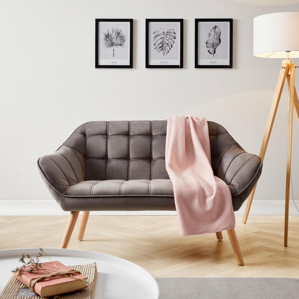 Tento výrobok je k dispozícii IBA ONLINE. Táto pekná dvojmiestna tmavosivá pohovka s retro nádychom je so svojimi kompaktnými rozmermi cca 127 x 76 x 74,5 cm (Š/V/H) vhodná aj do menších priestorov. Priedušné polstrovanie z polyéterovej peny a hrubé čalúnené opierky na ruky sa postarajú o pohodlné sedenie. Drevené nohy dodávajú pohovke príťažlivý vzhľad. Celkový dizajn podčiarkuje dekoratívne prešitie na opierke a sedáku. Pohovka je celočalúnená, takže je možné ju umiestniť kamkoľvek do priestoru. Maximálna nosnosť je 240 kg. Najdôležitejšie informácie: Farba: zamatová tmavosivá/ prírodná Materiál: drevo / textil Š/V/H: cca 127 x 76 x 74,5 cm Výška nôh: cca 28 cm <