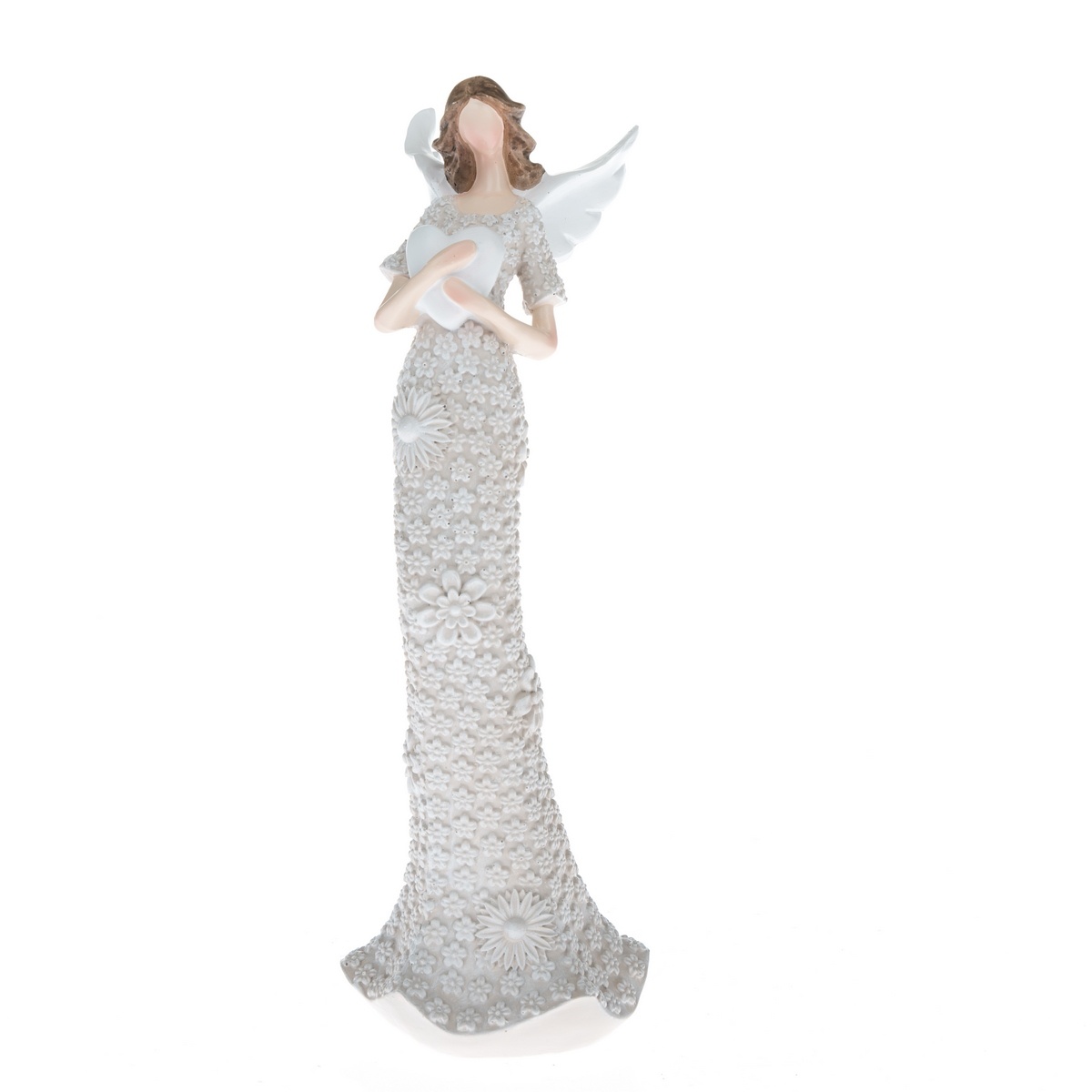 Nádherný dlhovlasý anjel bude krásne zdobiť poličku či jedálenský stôl. V ruke má srdce. Šaty sú ozdobené drobnými kvietkami.