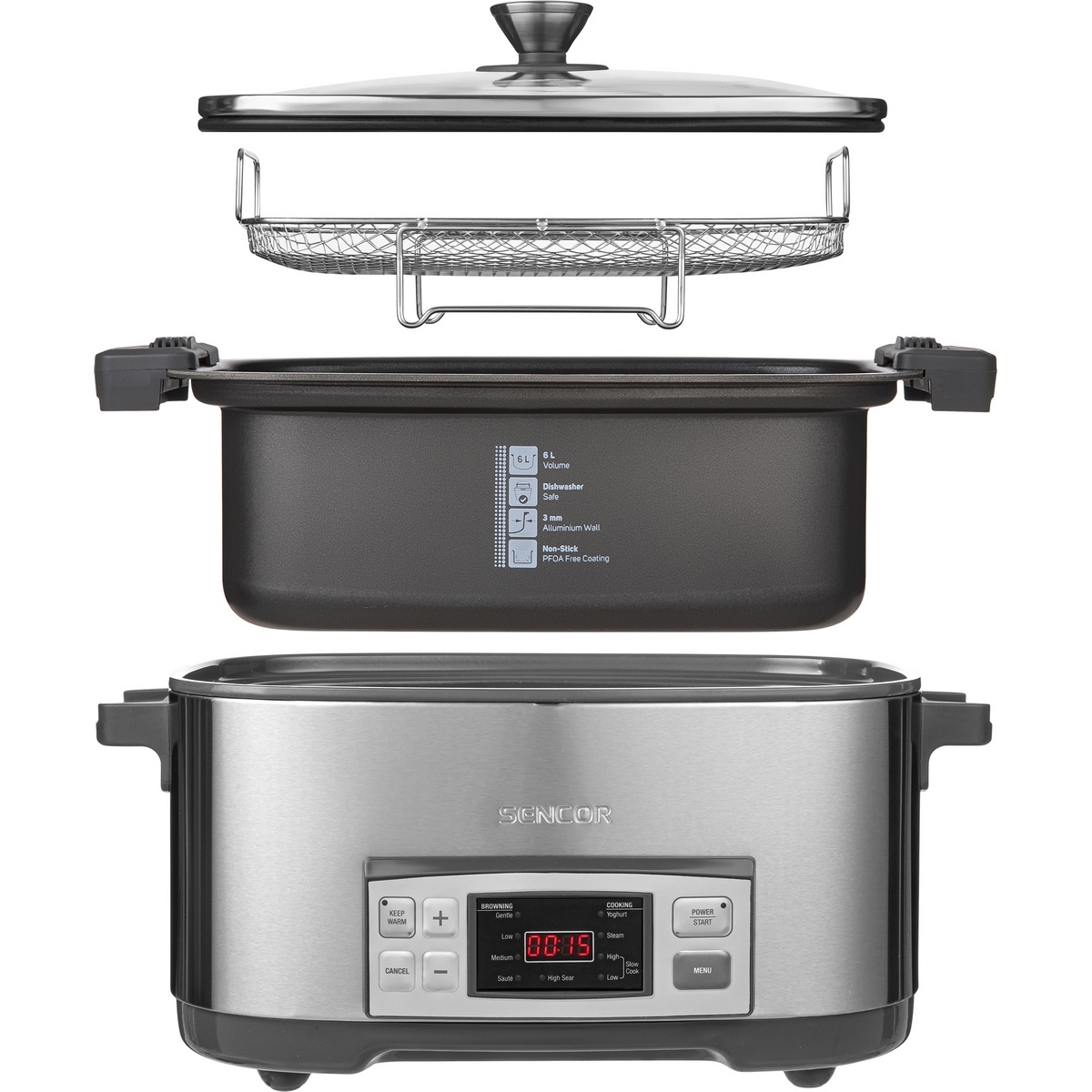 Inovatívny hrniec na pomalé varenie SPR 5500SS značky SENCOR sa stane nenahraditeľným pomocníkom každej gazdinky. Vynikajúci pre varenie polievky, gulášu, džemu, jahňacieho mäsa, hovädzieho mäsa, zeleniny, vajec atď. Jedlá pomalým varením získavajú oveľa výraznejšie chute, hoci sa pripravujú iba s malým množstvom korenia, soli a bez tuku. Vnútorná nádoba s objemom 6 l má steny z hliníkovej zliatiny s hrúbkou 3 mm a je potiahnutá vrstvou s technológiou zabraňujúcou prichytávanie pokrmov a neobsahujúcou PFOA. Môže byť uložená do chladničky a možno ju umývať v umývačke riaduVlastnosti a špecifikácie: