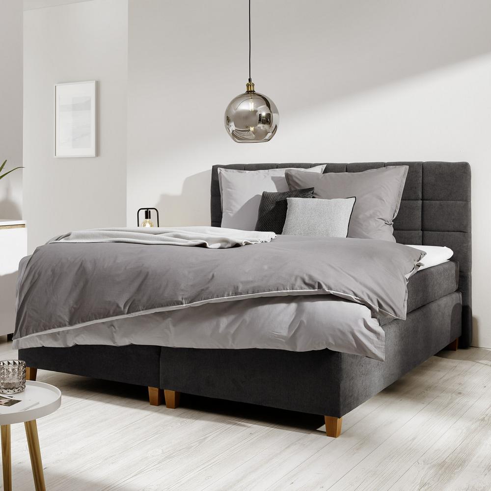 Tento výrobok je k dispozícii IBA ONLINE.Spánok v luxuse – táto atraktívna boxspring posteľ s elegantným poťahom zo sivej látky sa stane skvelým doplnkom vašej spálne. Rovná a mäkká čalúnená čelná doska poskytuje ďalšie mäkké pohodlie, kužeľové nožičky vyrobené z jelšového dreva harmonicky zapadajú do celkového obrazu. Pevnú základňu tvorí približne 28 cm vysoký box s bonellovými pružinami, v ktorom sa nachádzajú dva, asi 90 x 200 cm (Š x V) veľké 7 zónové matrace s jadrom s taštičkovými pružinami a stredným stupňom tvrdosti H2 pre ideálne pohodlie pri spánku. Matrace sú pokryté ochranným topperom so studeným penovým jadrom a výškou asi 6 cm.Upozornenie: Tento tovar nie je vystavený ani dostupný skladom v kamenných predajniach. Je možné ho kúpiť cez e-shop Möbelix alebo na požiadanie v našich predajniach.