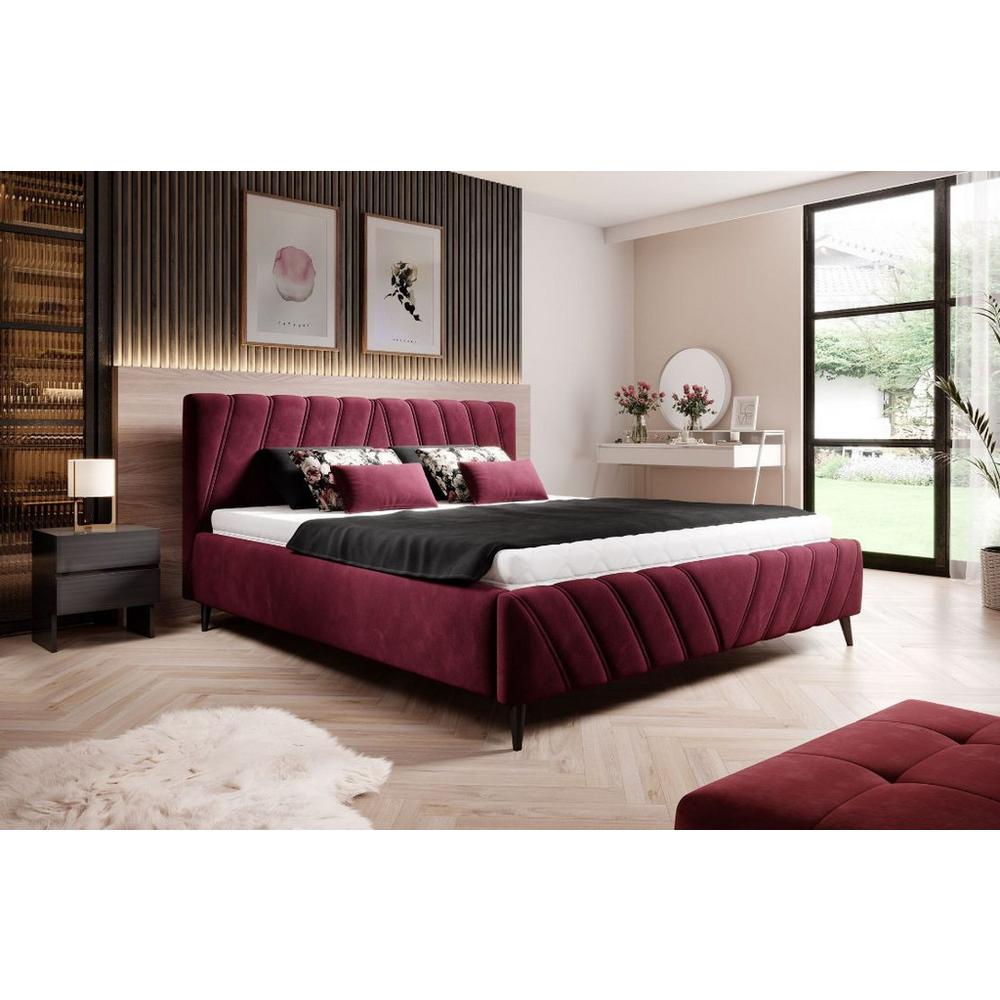 Tento výrobok je dostupný IBA ONLINE. Očarujúca čalúnená posteľ MELLI hneď na prvý pohľad upúta svojím jedinečným vzhľadom s bordovým velúrovým poťahom a ozdobným prešívaním na vysokom záhlaví a nožnej časti. Čierne kónické nožičky, vysoké …