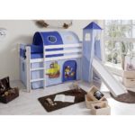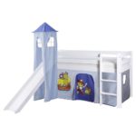 Hracia posteľ KASPER prináša zábavu a vzrušenie do detskej izby. Tento výrobok je k dispozícii IBA ONLINE. Dodanie je zadarmo. „Všetci na palubu!“ je mottom všetkých malých pirátov, ktorí si obľúbia túto skvelú detskú postieľku, vyrobenú z masívnej borovice s bielym ochranným náterom. Pri celkovom rozmere cca 206 x 217 x 195 cm (D x Š x V) je k dispozícii nielen pohodlná horná plocha na ležanie asi 90 x 200 cm (Š x D) s ochranou proti pádu, ale aj dostatok priestoru na behanie, skrývanie a hranie sa. Pekný záves v modrej farbe s pirátskym motívom povzbudí vaše deti k nápaditej hre – budú zaneprázdnené hrami a zažijú veľa dobrodružstiev aj so súrodencami a kamarátmi. Kým na vrchné lôžko postele sa dá ľahko a bezpečne dostať po rebríku, pre cestu späť na zem je dobrou voľbou zábavná šmykľavka, ktorá vychádza z hradnej veže. Tak zábavné! S touto všestrannou detskou postieľkou sa všetkým deťom splnia sny! Vhodné pre deti od 6 rokov. Matrac, rošt, lôžkoviny a vyobrazené dekorácie a doplnky nie sú súčasťou balenia. Tento tovar je k dispozícii IBA ONLINE,&