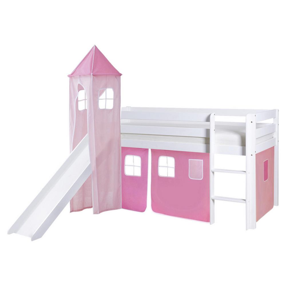 Hracia posteľ KASPER prináša zábavu a vzrušenie do detskej izby. Tento výrobok je k dispozícii IBA ONLINE. Dodanie je zadarmo.    Všetci malí dobrodruhovia si isto obľúbia túto skvelú detskú postieľku, vyrobenú z masívnej borovice s bielym ochranným náterom. Pri celkovom rozmere cca 206 x 217 x 195 cm (D x Š x V) je k dispozícii nielen pohodlná horná plocha na ležanie asi 90 x 200 cm (Š x D) s ochranou proti pádu, ale aj dostatok priestoru na behanie, skrývanie a hranie sa. Pekný záves ružovej farby povzbudí vaše deti k nápaditej hre – budú zaneprázdnené hrami a zažijú veľa dobrodružstiev aj so súrodencami a kamarátmi. Kým na vrchné lôžko postele sa dá ľahko a bezpečne dostať po rebríku, pre cestu späť na zem je dobrou voľbou zábavná šmykľavka, ktorá vychádza z hradnej veže. Tak zábavné! S touto všestrannou detskou postieľkou sa všetkým deťom splnia sny! Vhodné pre deti od 6 rokov. Matrac, rošt, lôžkoviny a vyobrazené dekorácie a doplnky nie sú súčasťou balenia. Tento tovar je k dispozícii IBA ONLINE, a zároveň je to tovar s doručením formou <