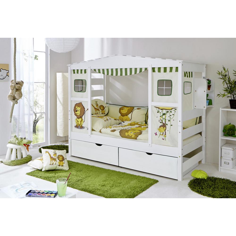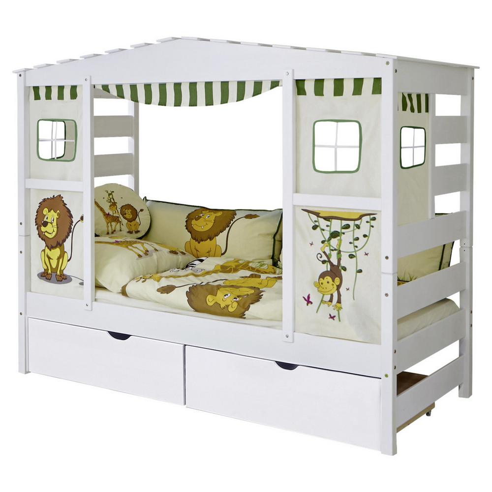 Tento výrobok je k dispozícii IBA ONLINE. Dodanie je zadarmo.    Táto detská postieľka, vyrobená z masívneho borovicového dreva s bielym náterom, vyžaruje útulný pocit bezpečia. Okrem pohodlnej plochy na ležanie cca 90 x 200 cm (Š x D) ponúka deťom a mládeži dostatočný útulný priestor na odpočinok a hry. Postieľka má dobrú stabilitu a celkové rozmery cca 213 x 100 x 165 cm (D x Š x V). S dvomi zásuvkami pod posteľou môžete vy alebo vaše dieťa upratať detskú izbu v niekoľkých jednoduchých krokoch a mať všetko prehľadne zoradené.  Posteľ hneď na prvý pohľad upúta farebným závesom s motívom safari – vytvára tak malý útulný domček, ktorý má dokonca aj strechu a okná! Malí objavitelia sa tu môžu pohodlne vyspať alebo relaxovať s dobrodružnou knihou.  V cene nie je zahrnutý lamelový rošt, matrac, obliečky ani dekorácie. Táto posteľ na hranie je snovým „domovom“ pre malých objaviteľov!  Tento tovar je k dispozícii IBA ONLINE, a zároveň je to tovar s doručením formou DROPSHIPPING.