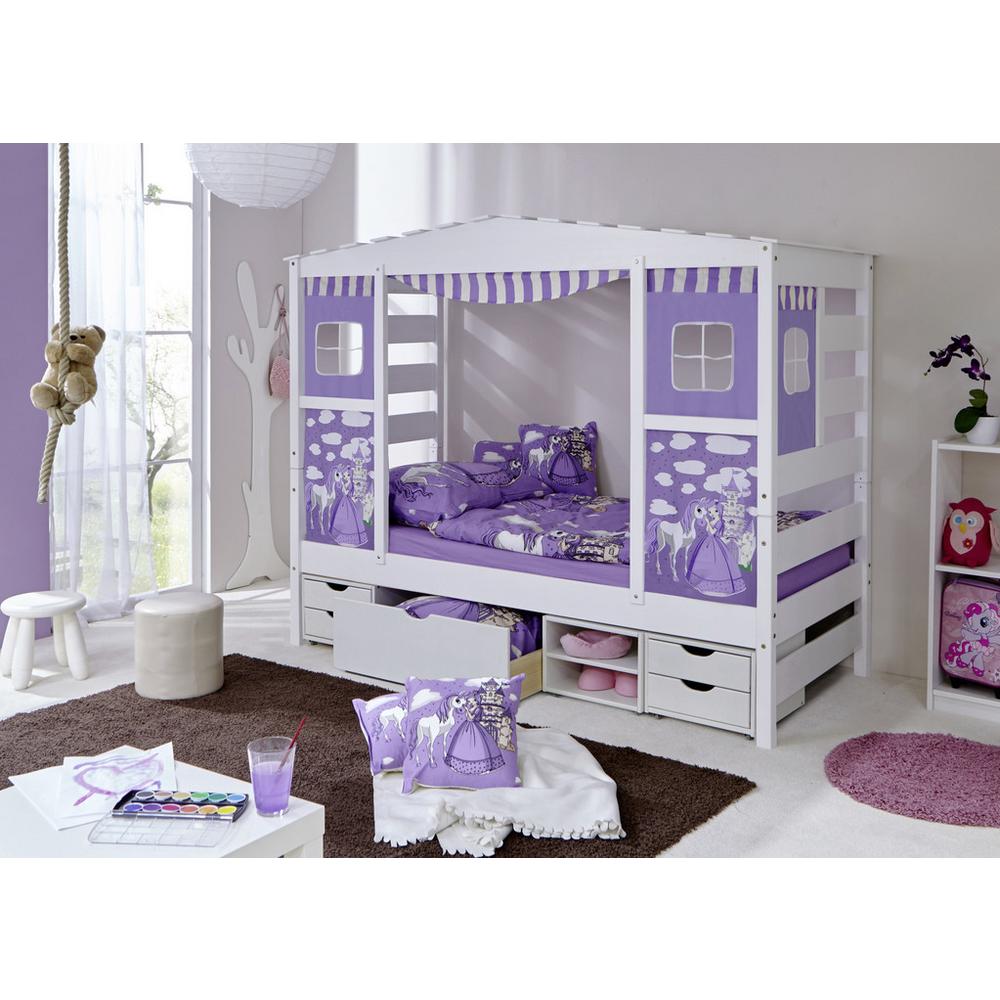 Tento výrobok je k dispozícii IBA ONLINE. Dodanie je zadarmo. Táto detská postieľka, vyrobená z masívneho borovicového dreva s bielym náterom, vyžaruje útulný pocit bezpečia. Okrem pohodlnej plochy na ležanie cca 90 x 200 cm (Š x D) ponúka deťom a mládeži dostatočný útulný priestor na odpočinok a hry. Postieľka má dobrú stabilitu a celkové rozmery cca 213 x 100 x 165 cm (D x Š x V). S piatimi zásuvkami rôznych veľkostí a s dvomi otvorenými priehradkami môžete vy alebo vaše dieťa upratať detskú izbu v niekoľkých jednoduchých krokoch, a mať všetko prehľadne zoradené. Posteľ hneď na prvý pohľad upúta fialovým závesom s motívom princeznej a jej koníka – vytvára tak malý útulný domček, ktorý má dokonca aj strechu a okná! Malé princezné sa tu môžu pohodlne vyspať alebo relaxovať s rozprávkovou knihou. V cene nie je zahrnutý lamelový rošt, matrac, obliečky ani dekorácie. Táto posteľ na hranie je snovým „domovom“ pre malých objaviteľov! Tento tovar je k dispozícii IBA ONLINE, a zároveň je to tovar s doručením formou DROPSHIPPING.
