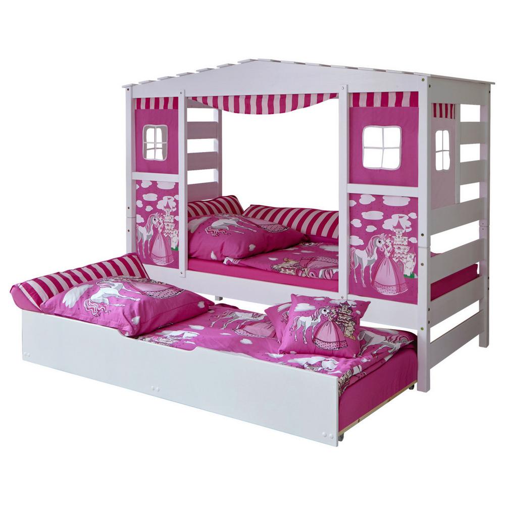 Tento výrobok je k dispozícii IBA ONLINE. Dodanie je zadarmo. Táto detská postieľka, vyrobená z masívneho borovicového dreva s bielym náterom, vyžaruje útulný pocit bezpečia. Okrem pohodlnej plochy na ležanie cca 90 x 200 cm (Š x D) ponúka deťom a mládeži dostatočný útulný priestor na odpočinok a hry. Postieľka má dobrú stabilitu a celkové rozmery cca 213 x 100 x 165 cm (D x Š x V). Vďaka ďalšiemu výsuvnému lôžku s rozmerom cca 90 x 200 cm (Š x D) môžete ubytovať ďalšieho detského hosťa. To je nielen obzvlášť praktické v menších miestnostiach, ale je to aj dvakrát zábavnejšie! Cez deň môže toto prídavné lôžko dobre poslúžiť ako úložný priestor na periny. Posteľ hneď na prvý pohľad upúta ružovým závesom s motívom princeznej a jej koníka – vytvára tak malý útulný domček, ktorý má dokonca aj strechu a okná! Malé princezné sa tu môžu pohodlne vyspať alebo relaxovať s rozprávkovou knihou. V cene nie je zahrnutý lamelový rošt, matrac, obliečky ani dekorácie. Táto posteľ na hranie je snovým „domovom“ pre malých objaviteľov! Tento tovar je k dispozícii IBA ONLINE, a zároveň j