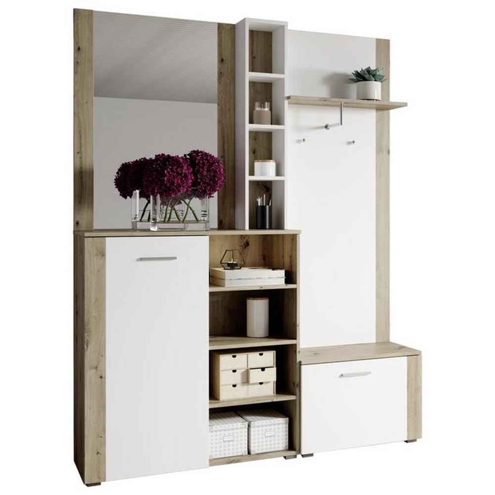 Tento tovar je k dispozícii IBA ONLINE. S touto súpravou šatní BARRY bude vaša predsieň viac než príjemná a vaši hostia sa okamžite budú cítiť ako doma. S celkovými rozmermi približne 150 x 190 x 32 cm (Š x V x H) obsahuje táto sada: Zrkadlo Šatňový panel Šatňa Šatňová lavica Pred odchodom z domu môžete skontrolovať svoj odev v zrkadle a pridať čiapku, ktorú si môžete nasadiť na poličku na klobúky. Bundy a kabáty je možné zavesiť na tyč na šaty a dva háčiky panelu bez pokrčenia. V šatni si svoje miesto nájdu topánky, čižmy a samozrejme papuče pre hostí. Skrinka má navyše štyri otvorené priehradky. Sada obsahuje aj praktickú šatňovú lavicu, na ktorú si môžete sadnúť, aby ste si mohli pohodlne obuť topánky. Model BARRY je vyrobený z dreveného dekoru a dodáva sa v nadčasových farbách bielej a dubovej farby. To dáva vašej predsieni útulný nádych. Upozornenie