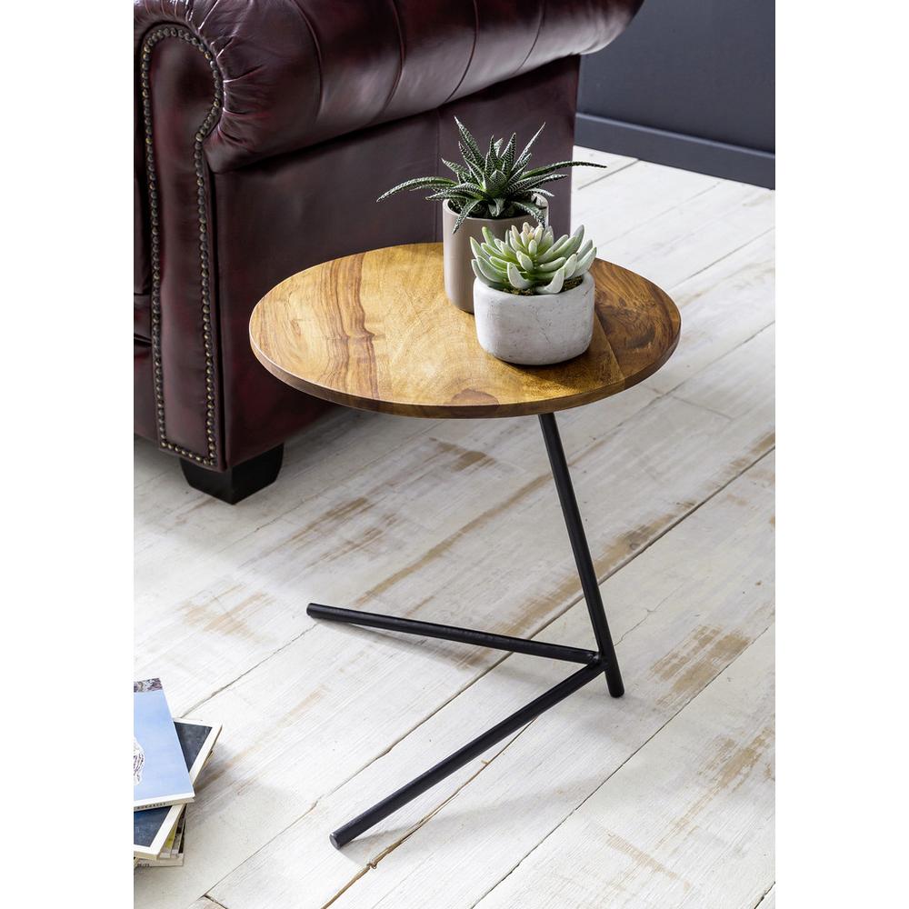 Tento výrobok je k dispozícii IBA ONLINE. Dodanie je zadarmo. Tento príručný stolík s okrúhlou doskou zo sheeshamového dreva vyzerá obzvlášť elegantne a netradične. Doska má hrúbku približne 25 mm a zaujme výraznou kresbou dreva. Rám je vyrobený z čierneho lakovaného železa. S celkovými rozmermi cca 40 x 46 x 40 cm (Š x V x H) tento malý stolík unesie záťaž až 20 kilogramov a poslúži ako atraktívna polička medzi sedačkou a kreslom v obývacej časti alebo ako nočný stolík vedľa postele. Tento tovar je k dispozícii IBA ONLINE, a zároveň je to tovar s doručením formou DROPSHIPPING. Čo to pre Vás znamená? (DROPSHIPPING) – rýchlejšie doručenie – tovar ide priamo od dod&aa